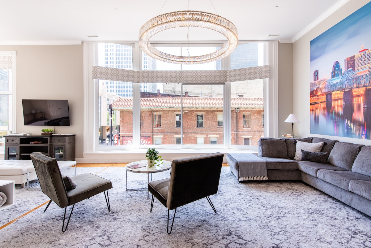 Located in historic downtown Louisville the Derby City Loft is a show stopper! This PENTHOUSE luxury condo offers stunning views and high end living. The open floor plan boasts 3 queen beds, curtains can be pulled to make it a 2 bedroom. Plus the oversized sectional sofa may sleep 2 comfortably as well. Fully stocked kitchens and bathrooms with everything! This home was designed and styled with your comfort in mind, kick back, relax and enjoy high style living at the Derby City Loft.
