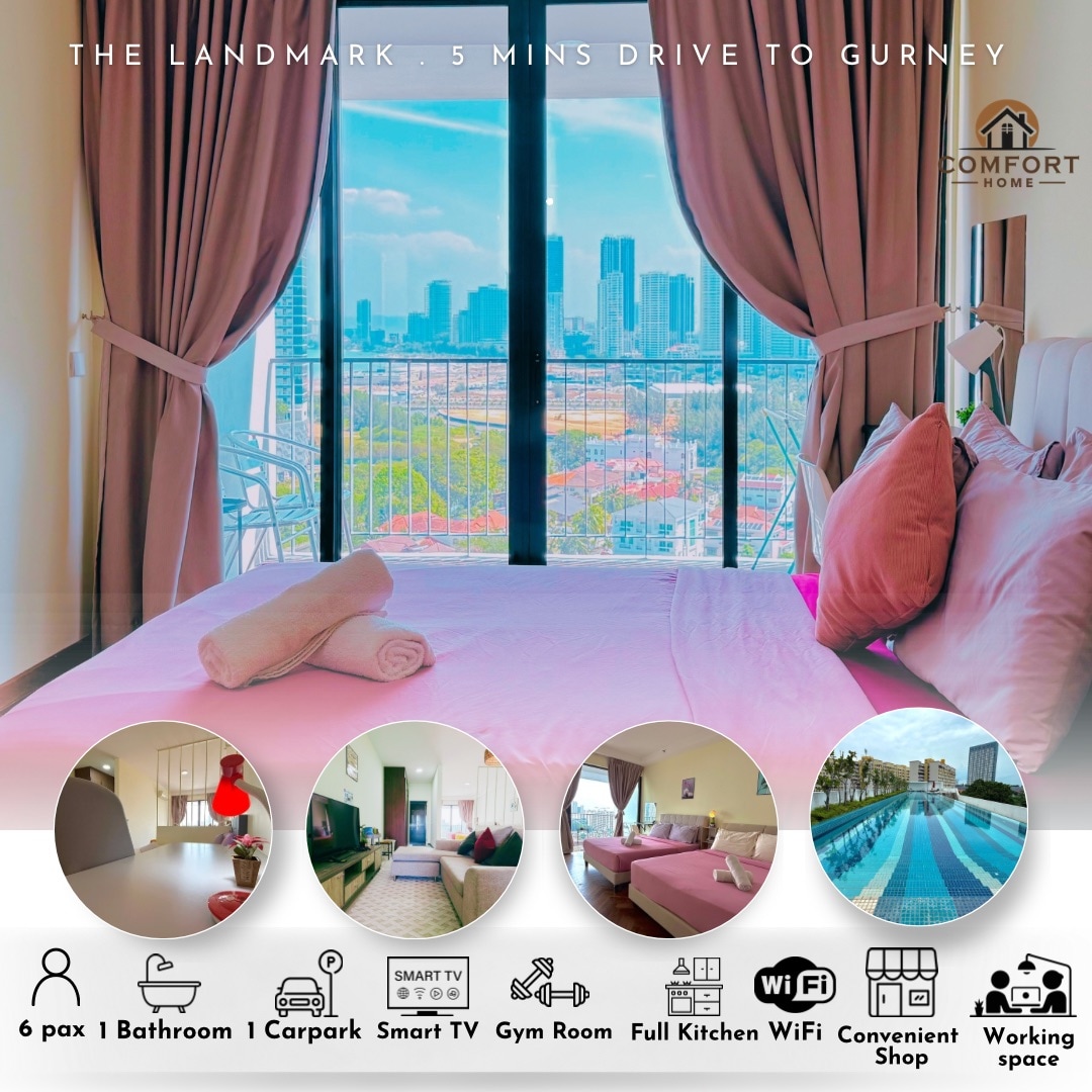 Our property is The Landmark by Comfy 1. Sunrise view 2. Ocean View 3. Gurney Coastline Seaview 4. High floor level 40 with 360 view of Penang 5. Large ocean view balcony 6. Olympic size adult pool 7. Kid pool 8. Children Playground 9. Air Conditioned Indoor Gym 10. The famous Gurney Plaza mall, Gurney Paragon Mall, Strait Quay Mall, Gurney Drive Night Market, Tesco are 3 minutes drive, 1km away. 11. UNESCO street art is 15 minutes drive, 7km away.