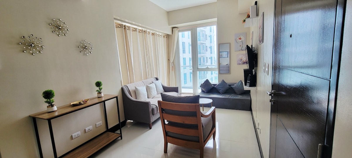 Your cozy One-Bedroom, corner unit with a minimalist feel, more privacy, and a serene view of the sea. Cleanliness and comfort are our top priority to travelers like you. Just a few steps to Starbucks, Robinsons, Watsons, restaurants, 7-11, McDonalds, and just about anything you need in your modern island living. Message me to know more ☺️