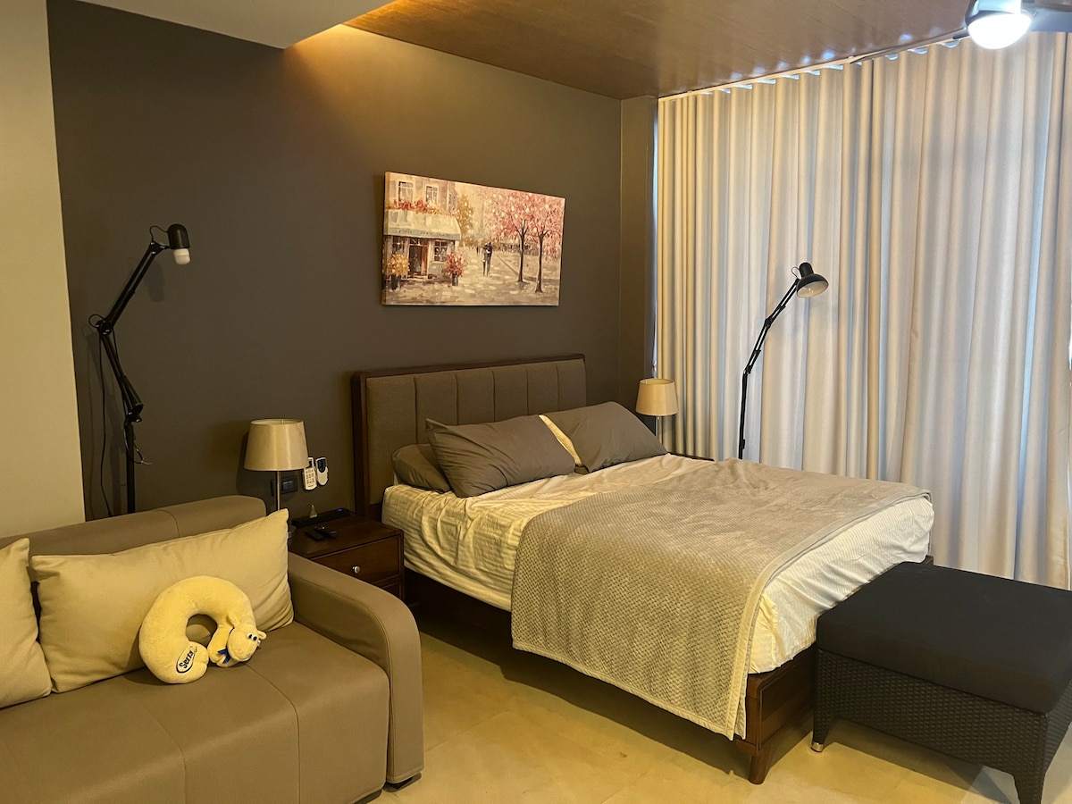 No detail is overlooked at this charming and upscale place to stay. A one bedroom suite inOne Manchester place with a beautiful finish and cozy feel bedroom and a living room that is convertible to a bedroom. Overlooking the beautiful Condos and hotels in Mactan Newtown and right in front of groceries, restaurants, bars, pharmacy and coffee shops. Enjoy the pool, spa and game room within and beach which is only a 5 minute walk. A perfect staycation. You don't need to worry about anything.