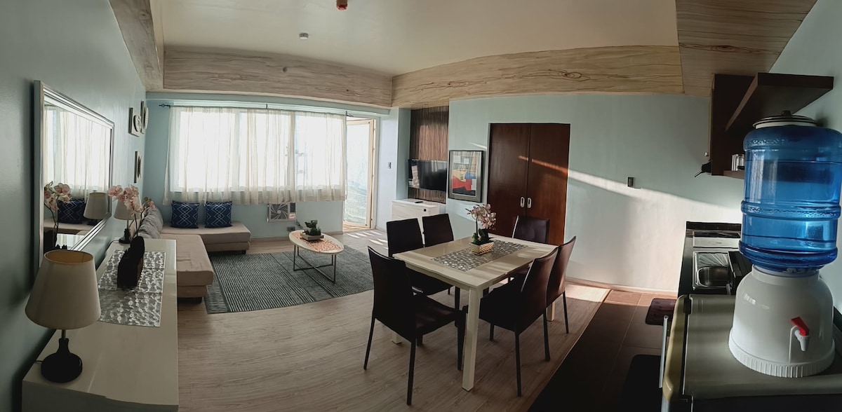 This comfortable and lovely 1BR Suite is your home away from home. Located on the high floor where you will find peace and tranquility, watching the sunrise and sunset in your own private patio. The patio has a view of the sea and lush greenery. All furnitures were meticulously picked and thoughtfully arranged to provide a homey feeling to all our guests. It is also equipped with high-speed internet, 55" smart TV in the living room, 43" in the bedroom and fully equipped kitchen.