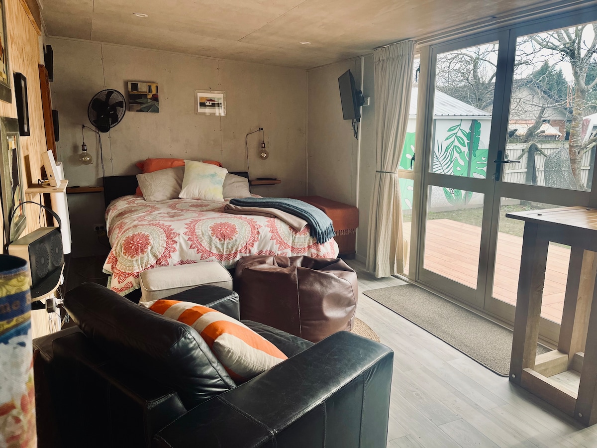 Beautiful, sunny, lovingly built, modern self contained studio. Everything you could need for a short stay in Christchurch; located in a quiet cul-de-sac less than 12 minutes from the airport, and 18 minutes to city centre. Fast WiFi, Smart TV with Netflix, private bathroom with high pressure shower, kitchenette with mini fridge, Nespresso coffee machine, jug and toaster. Cereals and milk provided for breakfast. Private access and your own private deck on which to relax outdoors