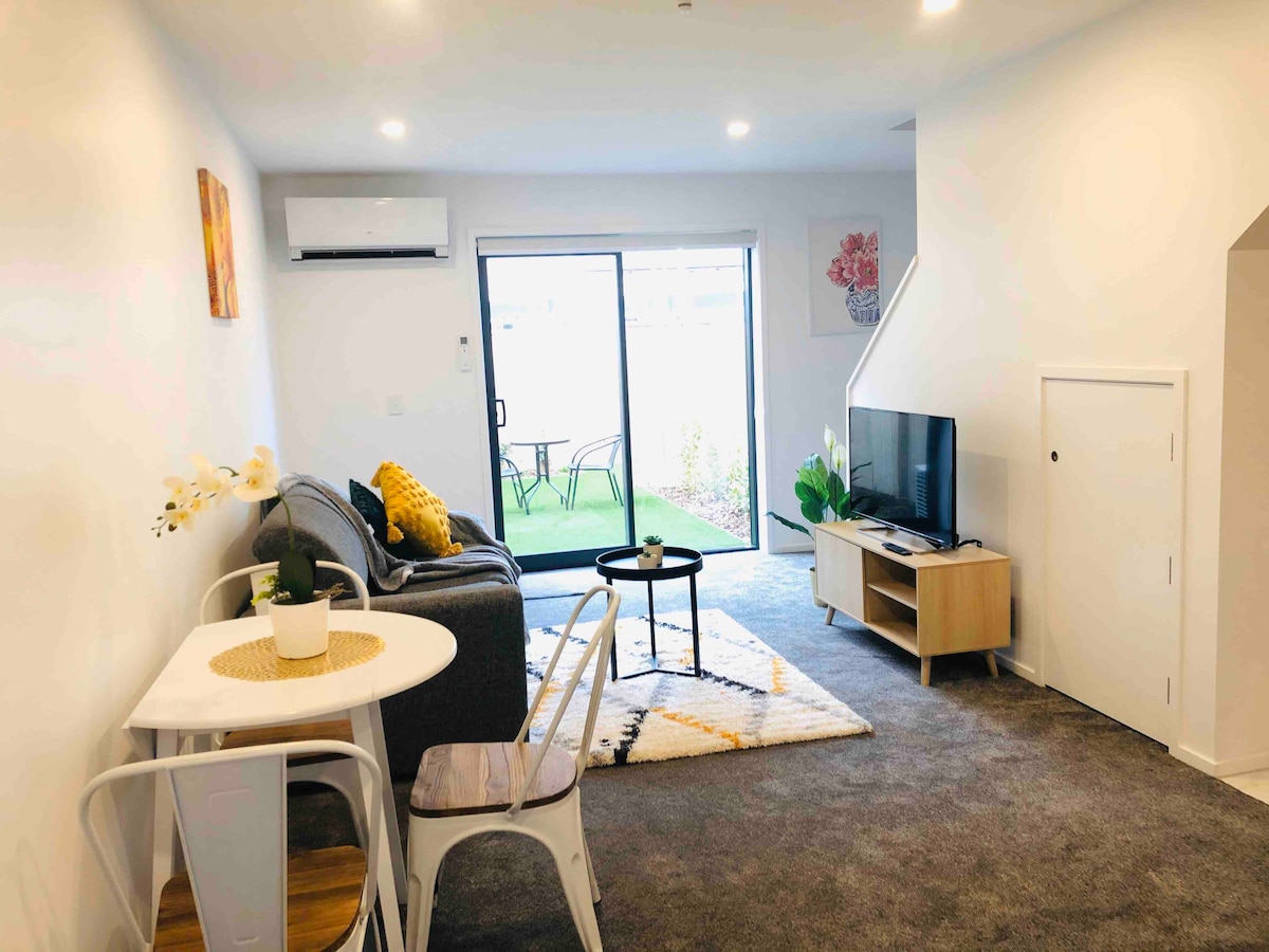 Charming 1-bedroom townhouse exuding style, featuring a foldout sofa for extra guests. North-facing with ample sunlight, enjoy a private courtyard and a fully equipped kitchen boasting all modern conveniences. Stay comfortable with a heat pump, high-speed fibre internet, a smart TV and washer/dryer combo. Perfectly located for easy strolls to all downtown attractions and eateries. A stone's throw to the Avon River, Townhall and Convention Centre and 900m to the new One NZ Te Kaha Stadium.