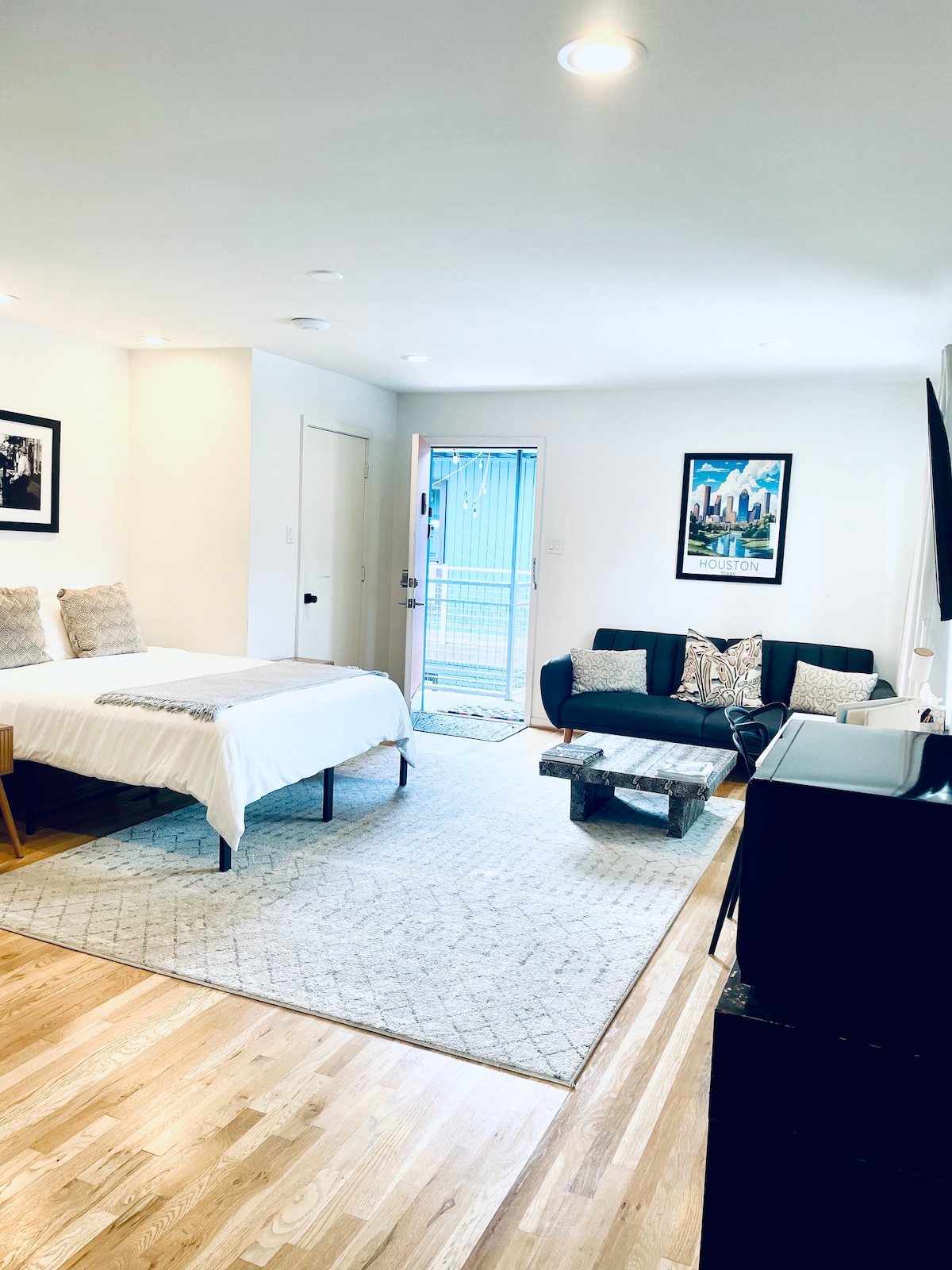 This Suite Studio 15 is a guest fave at Park JJ. Slightly larger than our other studios, it is a large open concept space perfect for 2 guests. You can have a 3rd guest fees apply as it has both a queen bed and a blue sleeper sofa . We aim to give excellent customer service. Our location is unbeatable Midtown/Montrose near Downtown, Texas Medical Center, Sports Stadiums, most Universities, Galveston, both Airports, Museums and many more! It is easy to explore all that Houston has to offer.