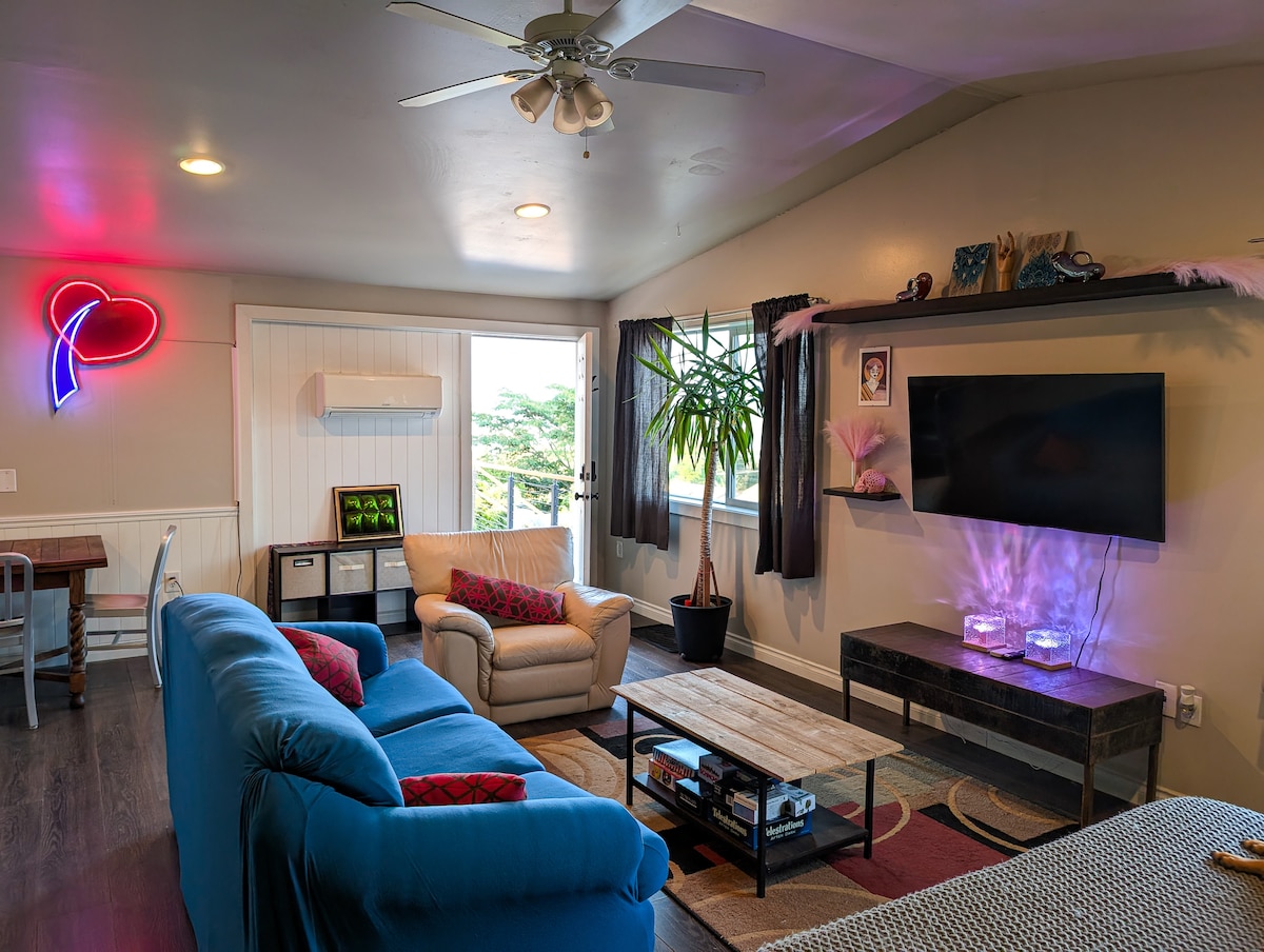 Centrally located custom built guesthouse minutes from downtown, airport, and beach. Walk to coffee/deli or 5m drive to local businesses, restaurants, and groceries. 1 bedroom, 1 bathroom guest house with a qn bed on the main level, addt'l qn bed in loft area leading to view deck accessed via "ship's ladder" stairs. Outdoor patio with seating. Qn sleeper sofa in livingroom area with large smart tv and LED fireplace. Ideal for small families and couples. 4 guests.