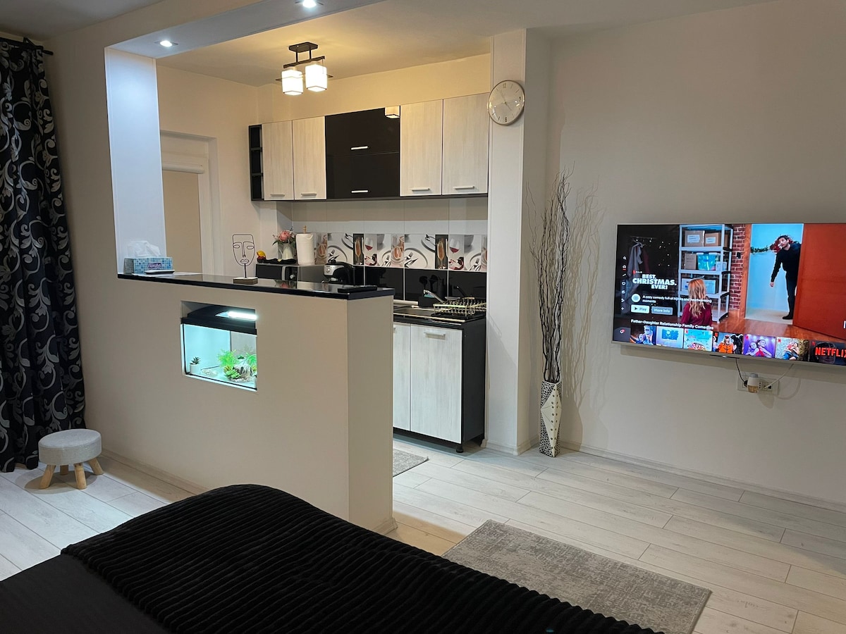 Bright and spacious studio apartment located in a 10 floors building, newly renovated with a fully equipped modern kitchen with an electric hob, integrated fridge and refrigerator, and all other necessary kitchenware for making a gourmet meal. It is placed in a great area with quiet neighbourhood, less than 15 minutes to City Centre, with direct public transportation to the old town, close to a big variety of beautiful parks and lakes such as Tei, Plumbuita, Circului. Free car park available.