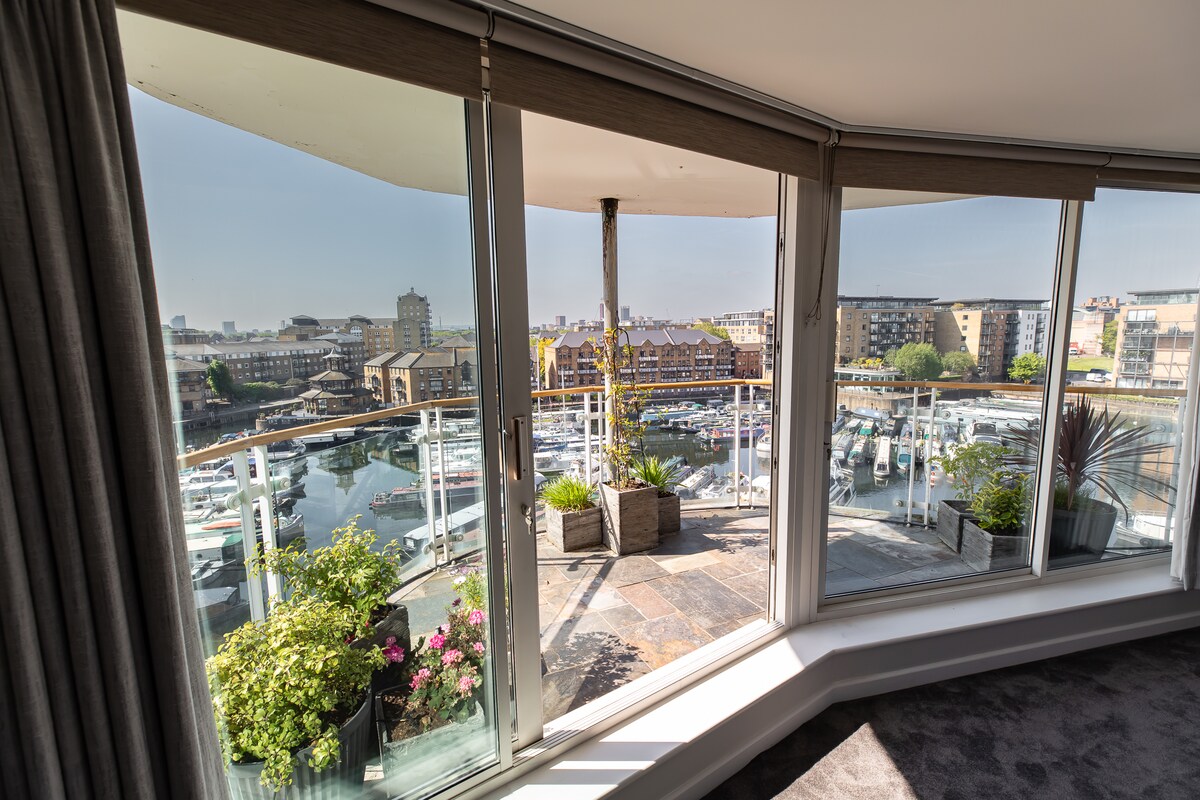 Sunny top floor apartment with AirCon & Stunning panoramic view of London (as on pictures) Two double bedrooms Two bathrooms Fully furnished Well equipped Luxury beddings & towels Spotless clean and quiet Free parking (request in advance ) Private Gym Private fenced community garden 5 min walk to ExCeL 1 min walk to Tesco Express supermarket Next to DLR station, Cable Car, near Elizabeth line CustomHouse station , short journey to The O2 arena, Canary Wharf, The City, LCY