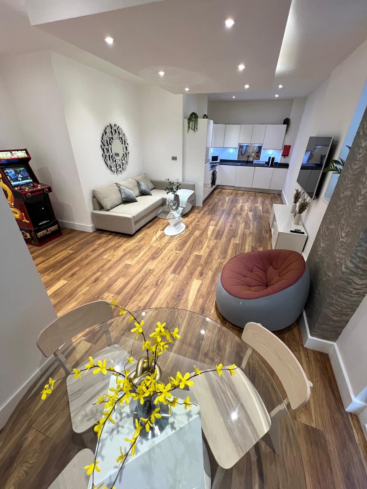 A bright, modern 1-bed apartment close to ExCel, Canning Town & O2. Comes with a spacious lounge, sleek kitchen and 2 contemporary bathrooms. Enjoy fast WiFi, comfortable bedding and a calm, minimalist space perfect for couples, professionals and travellers. Excellent transport links nearby for easy access to the city. 5 mins walk to DLR station and 10 min walk to Elizabeth Line station Easy access to Central London- 5mins to Canary Wharf 20 mins to Tottenham Court Road/Oxford Street via train
