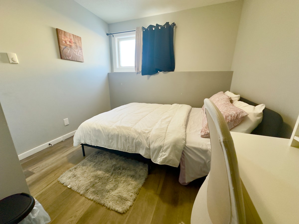 Private room with a dedicated workspace in our home with access to a shared full bathroom and an extra 1/2 bathroom. There is a shared kitchen with pots, pans, plates, bowls, cutlery, utensils and spices for your cooking needs. Room and full bathroom is located at the lower level while the kitchen and half bathroom are on the upper level. This space is located in a fairly quiet neighborhood. 5 minutes walk to both UCN and Kelsey’s recreation centre, 10 minutes walk to Grub box grocery store.