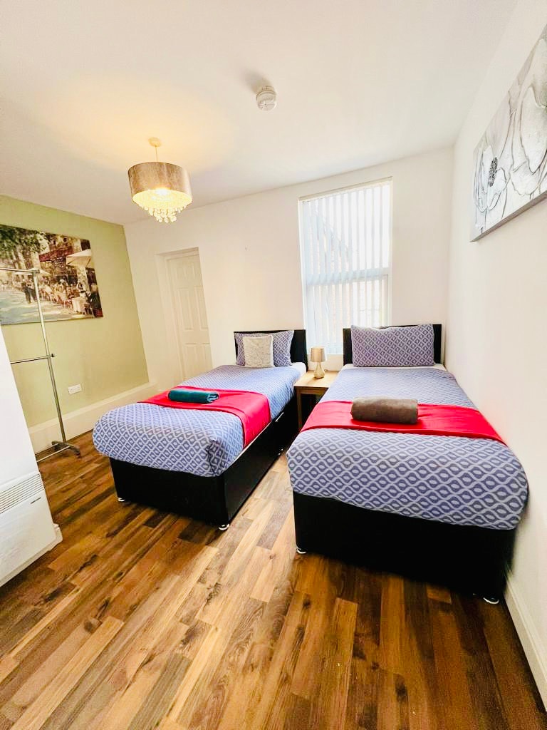 Located within walking distance of Barnsley town centre is this impeccable two bedroom apartment with brand new furnishings. Suitable for up to 4 people sleeping as couples in two separate bedrooms or using the two singles in the master bedroom, double in the second and sofa bed in the lounge. Once inside this accommodation is luxury with 200 count cotton bed linen, fluffy towels and luxurious vegan and eco friendly toiletries. USB points are located throughout including the shower room.
