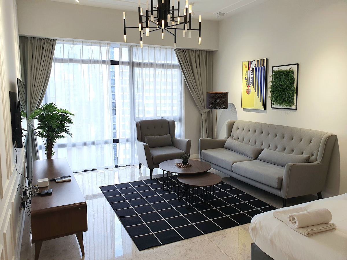 Why stay at Contemporary Suite at Lucentia Residence - the best views of KL - beautifully decorated with a fun spirit - centrally located - near public trans - fast wifi - 2 TVs with Netflix, Apple TV, Prime Video - 2 gorgeous pools - family friendly with baby crib & high chair - gym, pool table,BBQ pits, piano - garage parking - sleeps 3 max 5 - LalaPort Shopping Mall & the WOW entertainment street are attached - grocery, drug store, and many restaurants are attached - movie theatre GSC