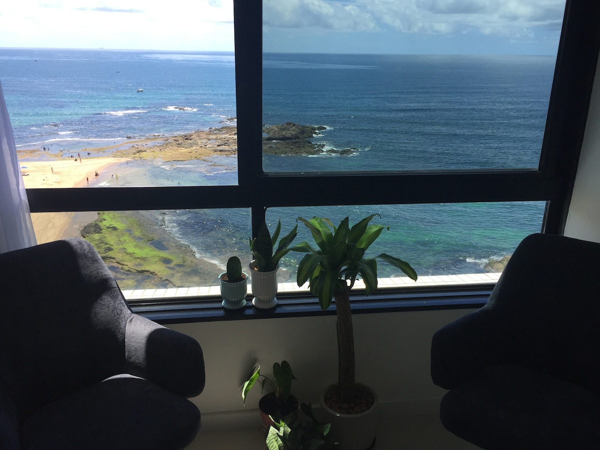 Você atravessa a rua e está na areia da praia, no mar! Ao voltar, que tal relaxar um pouco mais na piscina no terraço com vista panorâmica para o mar de Ondina? Aconchegante flat tipo studio em frente a linda praia com piscinas naturais, seguro, recepção 24h, serviço diário de camareira, piscina no terraço, elevador, garagem e lojas no prédio. Ondina é um dos melhores bairros para se hospedar em Salvador visto as comodidades e linda orla reformada. Precioso lugar!