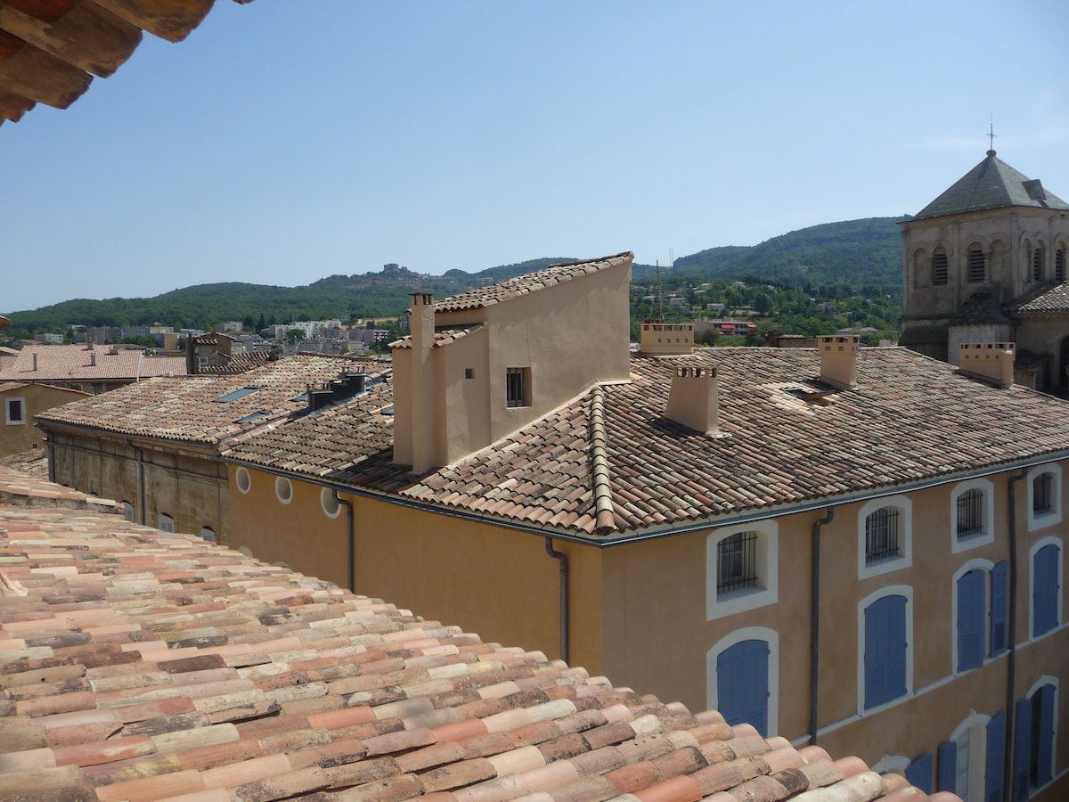 Au cœur du Luberon, dans un immeuble du 18ème, face à la cathédrale Sainte-Anne, un ancien séchoir rénové avec goût, qui vous offre une vue unique sur les toits de la ville jusqu’au Mourre Nègre et quelques villages du Luberon In the heart of the Luberon, in an 18th century building facing St-Anne Cathedral, a former drying house tastefully renovated and decorated, offering a unique view on the roofs of the city as far as the Mourre Nègre and some villages of the Luberon