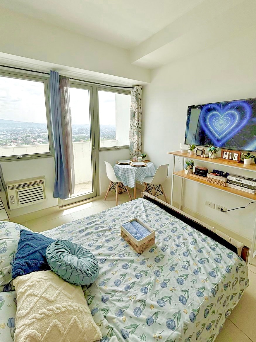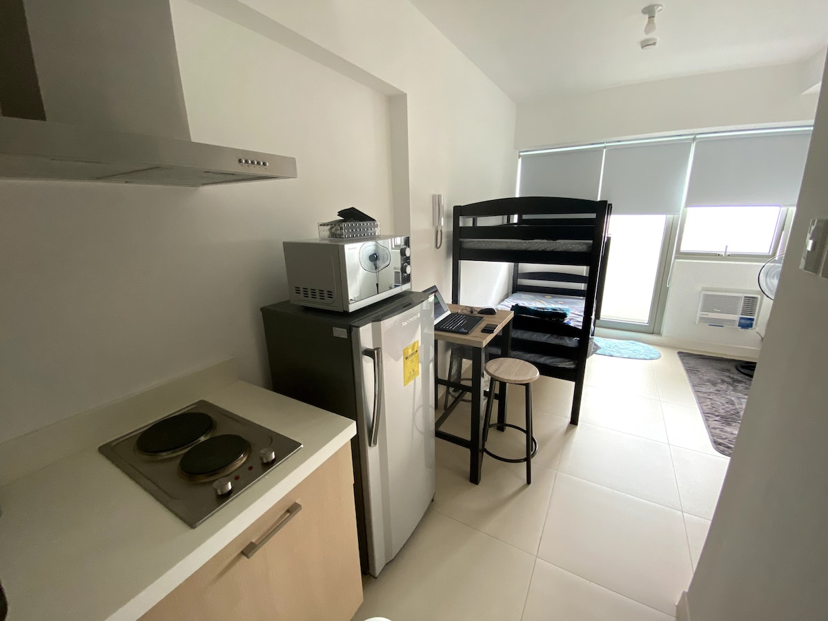 Sit back and relax in this peaceful hideaway. This 21sqm studio unit is situated in one of the newest buildings of The Residences @ Commonwealth, just at the back of Ever Gotesco. It showcases a queen size bed, fully functioning kitchen, zen bathroom, a dedicated work table and a bar type balcony set. It can comfortably accommodate up to 3 guests.