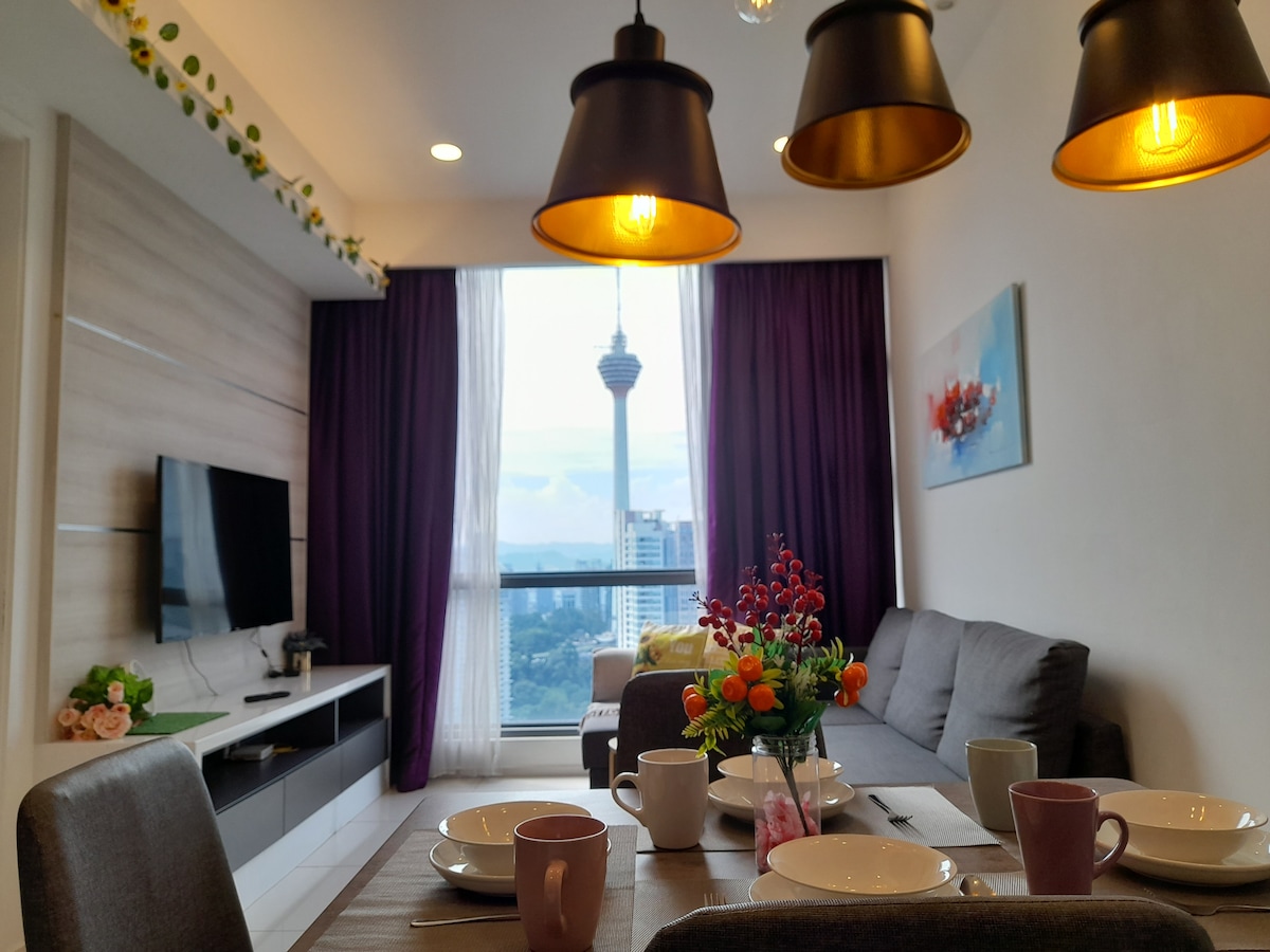 This 1 Br apartment comes with a breathtaking view of KL skyline. It has a 3-seaters sofa living room, dining table, kitchen, desk and a big balcony facing the KL Tower & Petronas Twin Towers. It comes with a 55” TV, Hi-Speed WIFI and a Queen size bed that can fit you comfortably. *The other unit of this Dual Key apartment is a compact Studio with Queen size bed, pantry, washroom & bath. It can fit in friends who travel with you with privacy. Welcome to ask for more details!