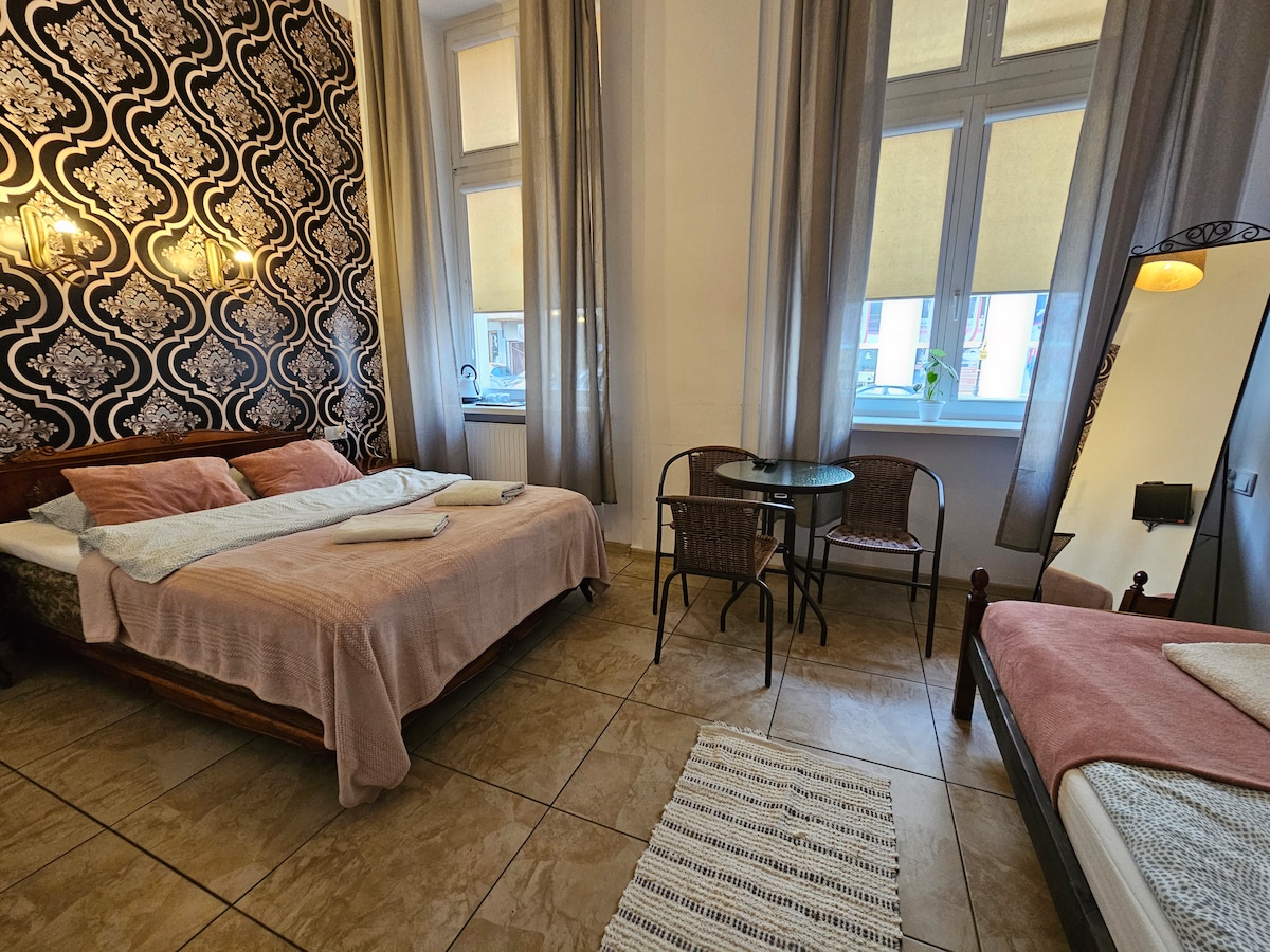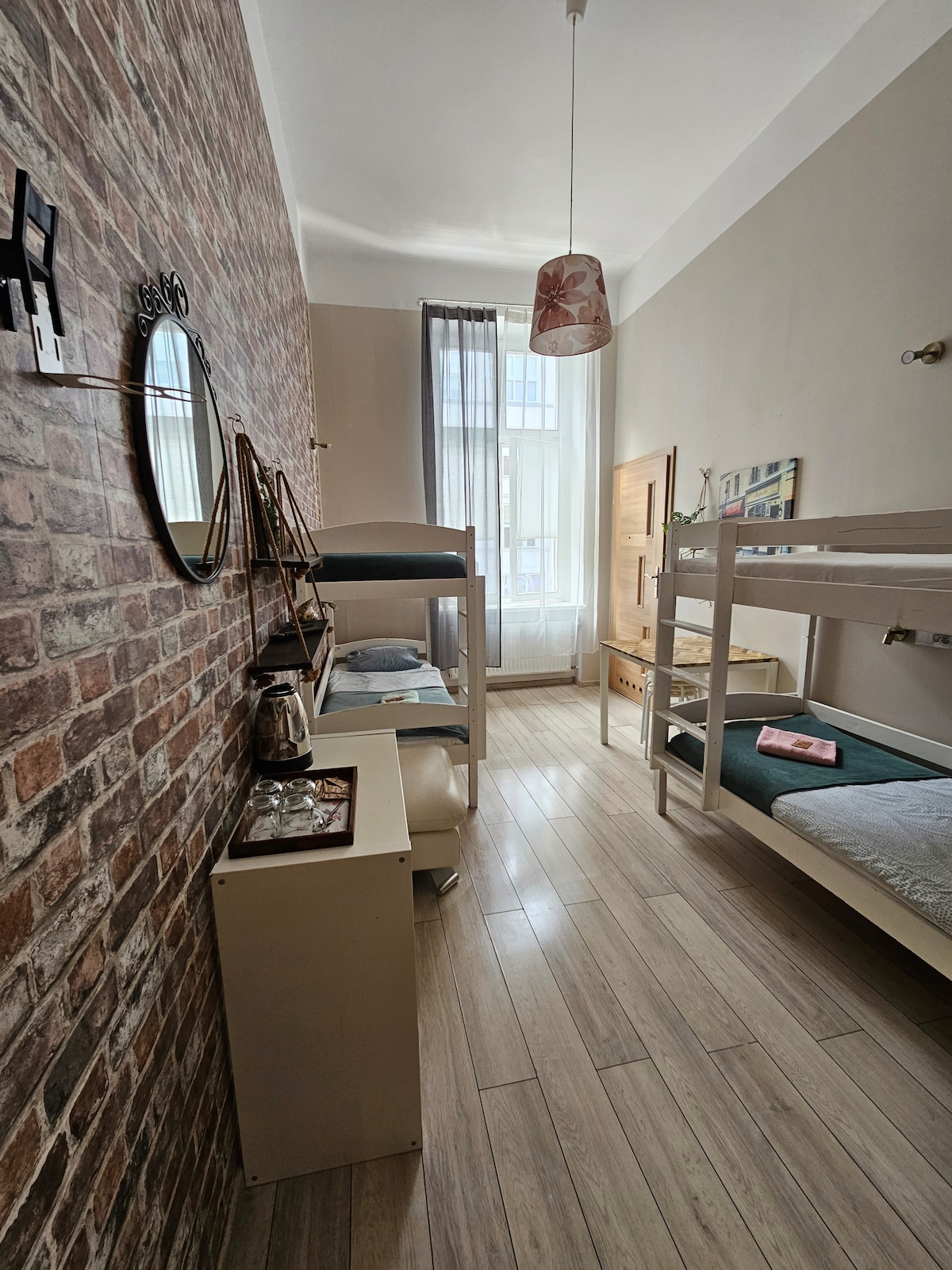 EDITH PIAF pokój wieloosobowy dla 1-6 osobowy (22m2) II piętro. Dwa łózka 90 cm pojedyncze i 2 łóżka piętrowe. Przestrzeń jest indywidualnie zaaranżowana. Wyposażenie apartamentu: telewizor 55 cali SMART, szafa, stolik, wentylator, stolik i krzesła. Do pokoju przynależy w pełni wyposażona kuchnia, toaleta i prysznic współdzielone z innymi gośćmi hostelowymi.