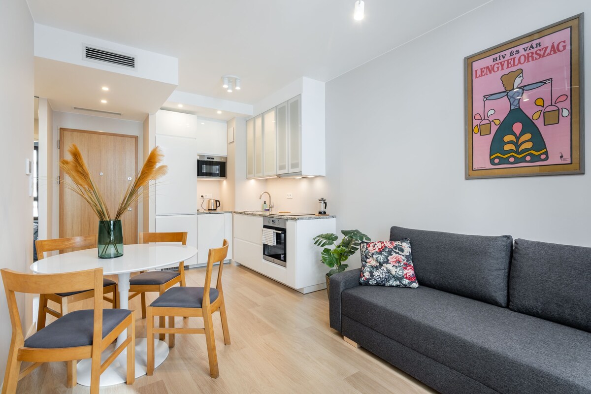 Komfortowy, w pełni wyposażony apartament w nowym budynku. Salon z otwartą kuchnią podzielony na część jadalną i wypoczynkową. W sypialni znajduje się duże łóżko i przestronna szafa. Jest także garderoba jako dodatkowe miejsce do przechowywania. W okolicy znajdują się sklepy, restauracje i kawiarnie Wyposażenie: klimatyzacja, ekspres, czajnik, żelazko, deska do prasowania, pralka Dojazd z Lotniska Chopina 20 min taxi 50 min komunikacja z Lotniska Modlin 50 min taxi 120 min komunikacja