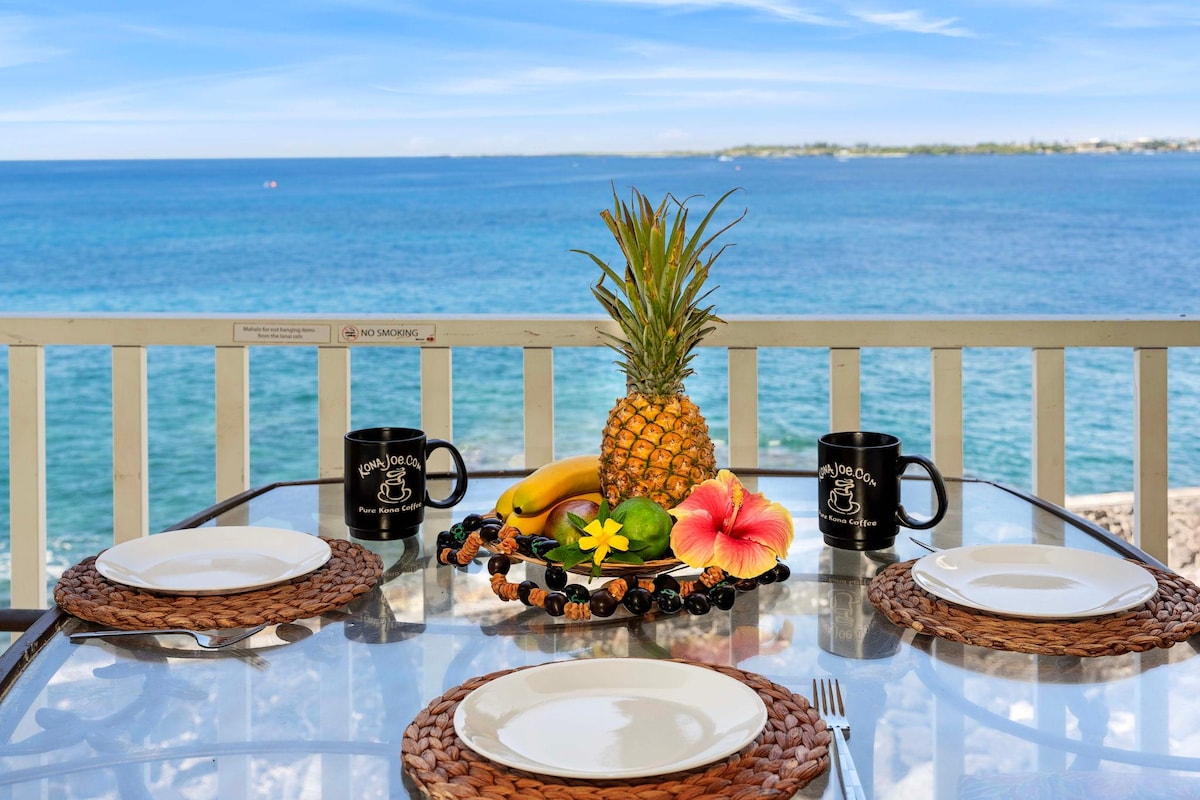 Serenity in Kona- with epic ocean views! Wake up with the ocean waves crashing below. Hang out on the lanai with some Kona coffee from the Green Flash cafe next door. You have a front row seat for whale watching during whale season. Or, hang out and enjoy the sunsets- at times with our local manta ray! We have a queen sofa bed, and AC. Close to town- an 18 minute walk. Quiet, very little road noise here. You can rent bikes too across the street.