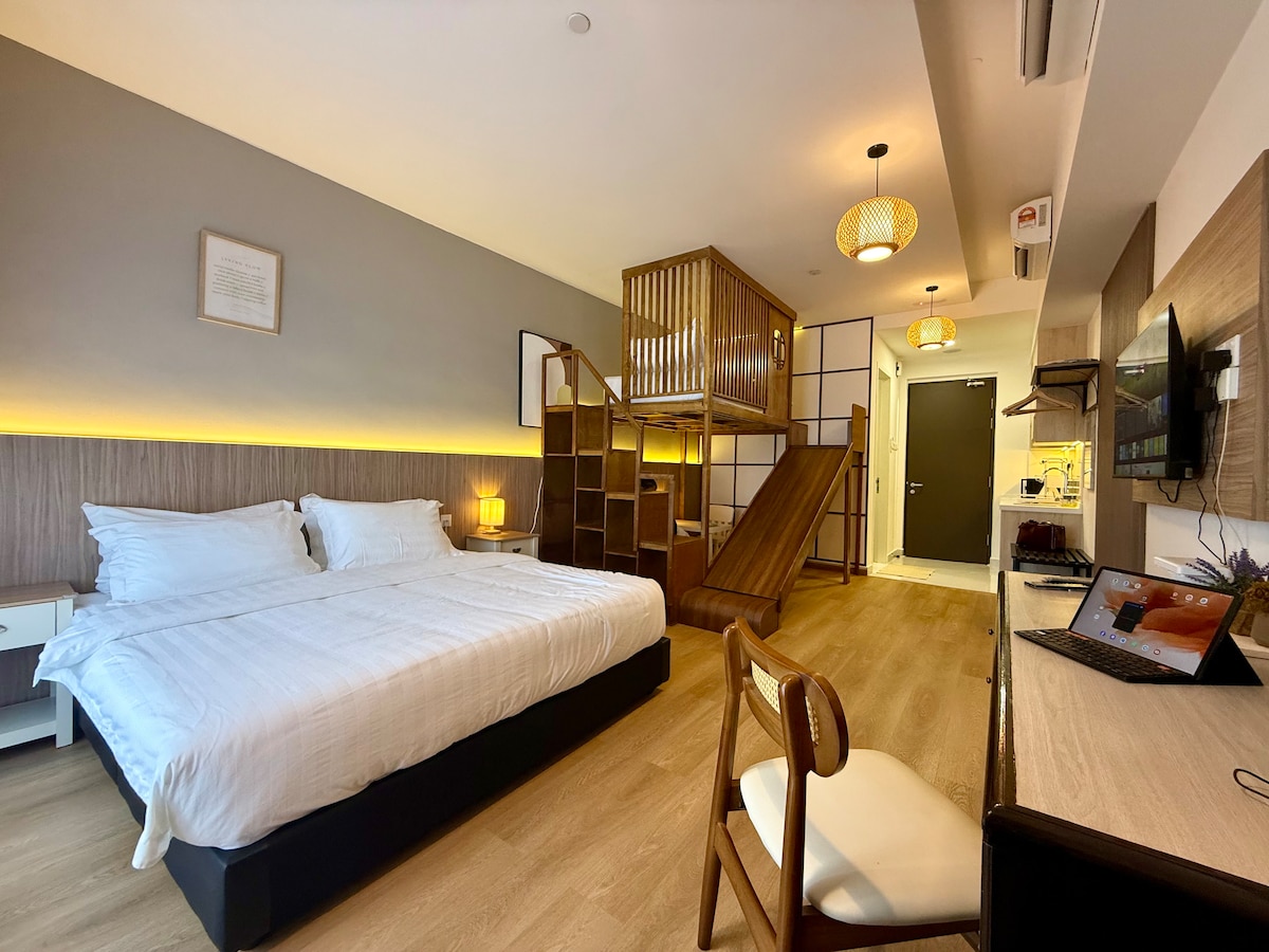 Stay in the heart of Kota Kinabalu at this cosy family loft in the city centre. The unit features a comfortable king bed, a fun loft with slide and play area, and a super single bed. Conveniently located just 10 minutes from KK International Airport (KKIA), 8 minutes to Jesselton Jetty, 10 minutes to Tanjung Aru Beach, and 5 minutes to the famous KK Night Market, shopping malls, and restaurants. Enjoy easy self check-in, swimming pool access, and a relaxing space after exploring the city.