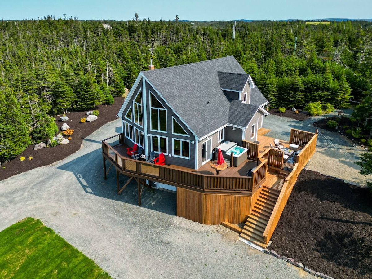 Note that no additional cleaning fees added and. 10 percent off for 5 nights or more Relax under the covered craftsman porch of this new custom designed beauty. The house checks all the boxes-ultimate privacy, large deck w/hot tub, vaulted ceilings with beams and a reading nook. Located in South River by Cupids/Brigus & a short walk from the ocean and a 7 min walk to the Nl Distillery. We are 45 mins west of St. John’s. The simple elegance of this house is refreshing for the soul