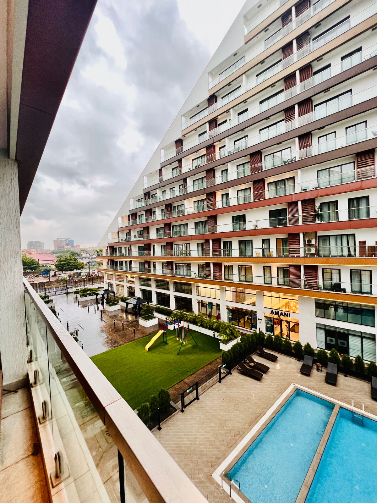 Enjoy this new, centrally located executive suite overlooking the airport. This newly furnished 7th-floor suite offers stunning city views from a private balcony. Guests have access to rooftop pools, state-of-the-art 11th-floor gym with panoramic views, serene ground-floor & rooftop gardens, an onsite restaurant & 24hr supermarket. Enjoy 24-hour professional security, biometric access, and secure underground parking. Located just 7 minutes from the airport and 6 minutes from Accra’s main mall.