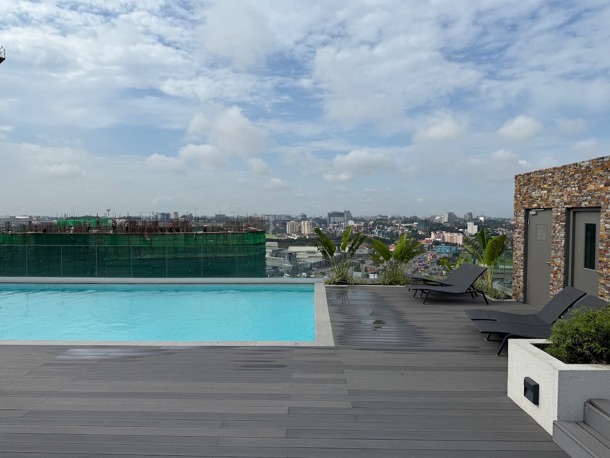 Enjoy a comfortable stay in this cozy 8th-floor apartment featuring a clean bathroom, fully equipped kitchen, and breathtaking city views. Everything you need for a relaxing stay is thoughtfully provided. Guests have access to a rooftop pool, free gym, and a private cinema (available upon request). 📍 Prime location: • 7 minutes from the airport • 4 minutes from Accra Mall • 5 minutes from the new Melcom