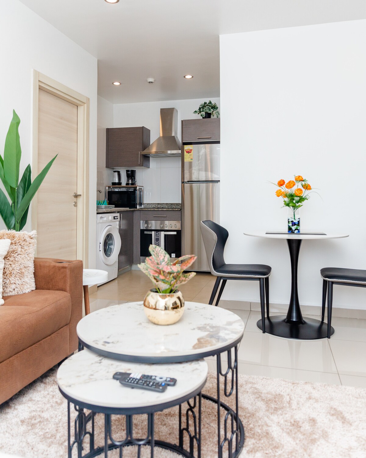 Enjoy this new, centrally located executive suite overlooking the airport. This newly furnished 7th-floor suite offers stunning city views from a private balcony. Guests have access to rooftop pools, state-of-the-art 11th-floor gym with panoramic views, serene ground-floor & rooftop gardens, an onsite restaurant & 24hr supermarket. Enjoy 24-hour professional security, biometric access, and secure underground parking. Located just 7 minutes from the airport and 6 minutes from Accra’s main mall.