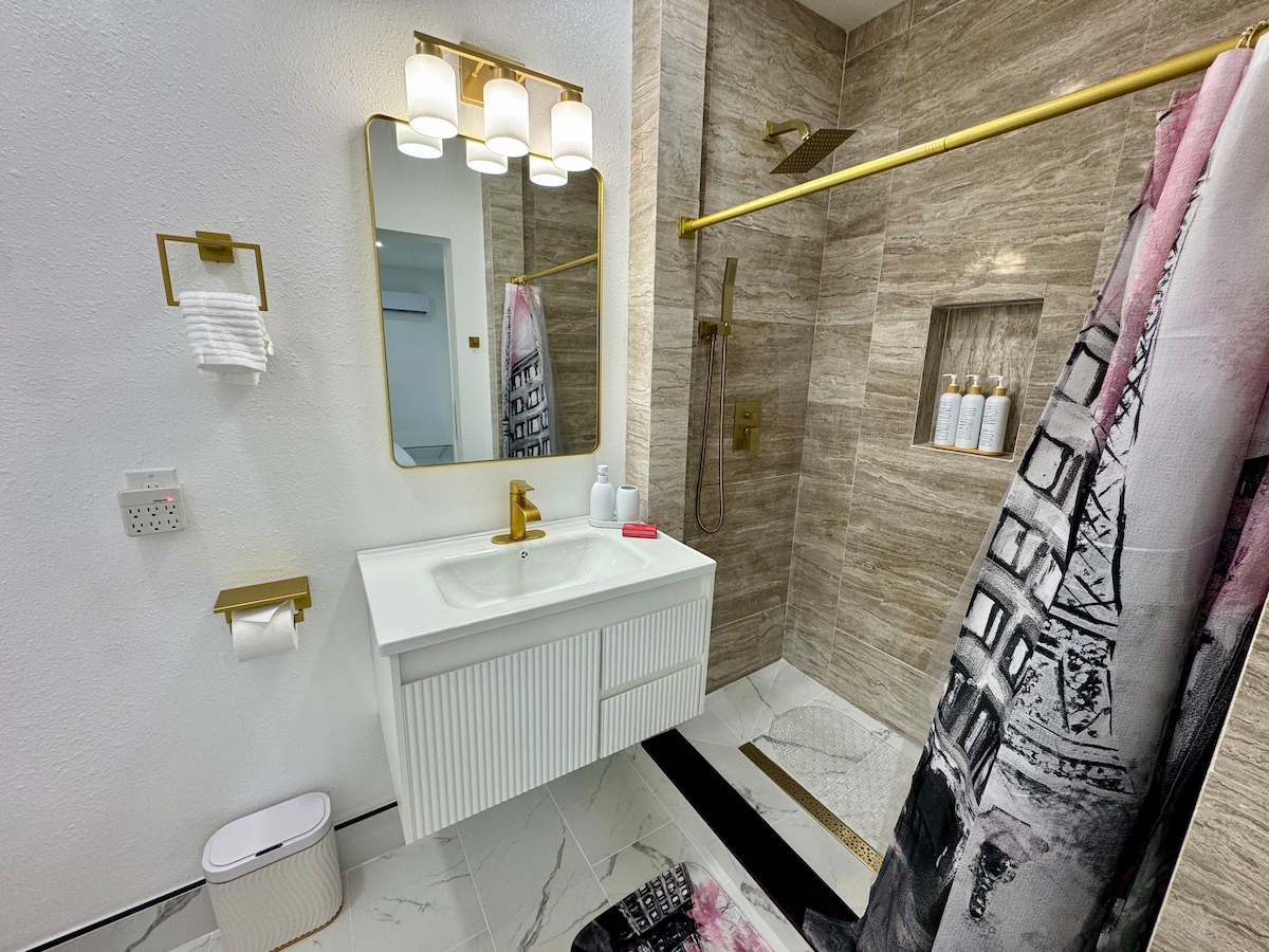 luxurious studio with private entrance, all decorated in black and white colors, has a kitchen with all kitchen accessories, queen bed, folding bed for another additional person, tv , air and heating are individual for the rest of the house since the studio has a mini split installed, it has a smoking area outside