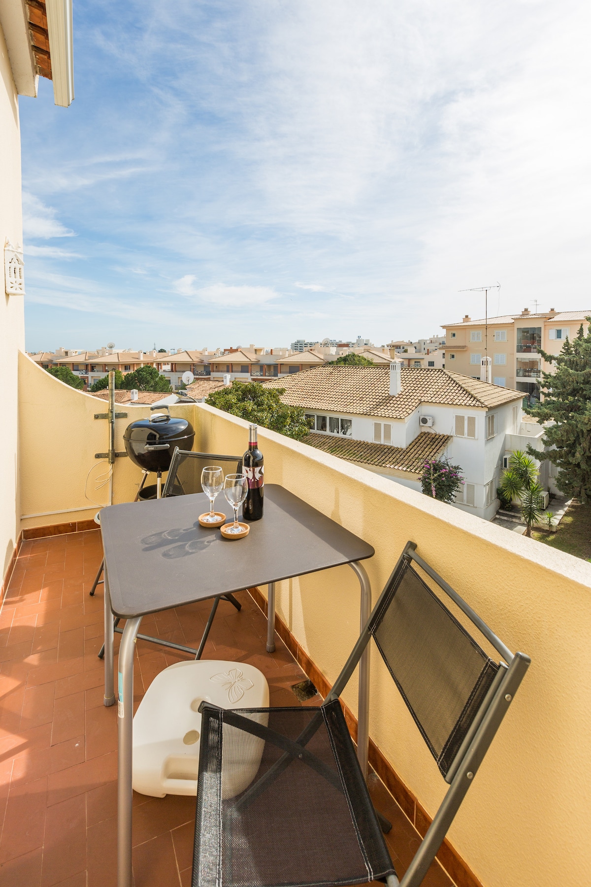 The apartment is situated in a gated aparthotel on a hillside with great views of the Old Town, Fisherman's Beach and out over the Atlantic. There is a south facing balcony which is ideal for soaking up the sun. The apartment is very family friendly as the balcony is on the ground floor not up high, there is no big drop. The balcony is also gated and the wall comes up to around hip height. Our main bedroom has a super king sized bed with the brand new mattress supplied by Hilton hotels.