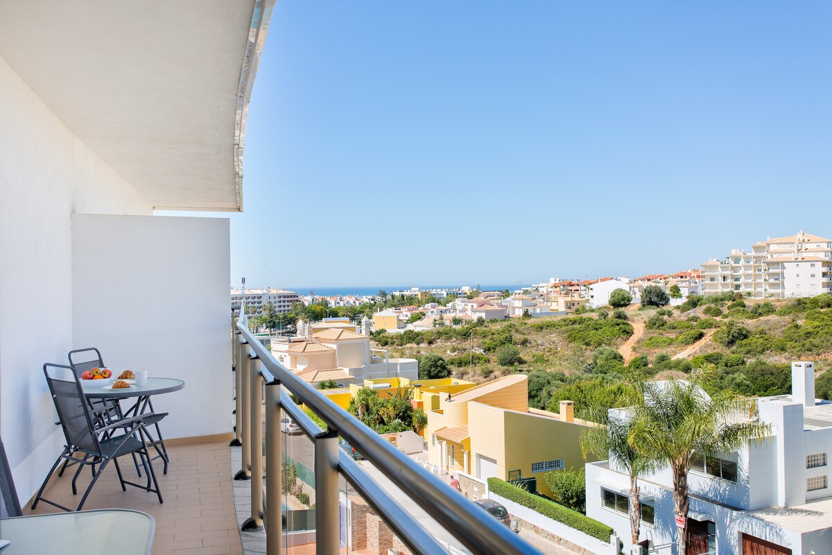 Apartamento composto por sala com kitchenette e um quarto, inserido num condomínio privado bastante calmo, com vista para o mar. A 1 km tem a Rua da oura, bons restaurantes e a praia no final, a 1.5 km. A 2km encontra a praia da Maria Luísa bem como, a praia dos praia dos Pescadores, a 3 km. O condomínio tem uma exelente piscina, uma piscinas para crianças com um parque infatil. Estas estão abertas de maio a outubro. No páteo, conta com um café bastante acolhedor, que serve snacks e bebida