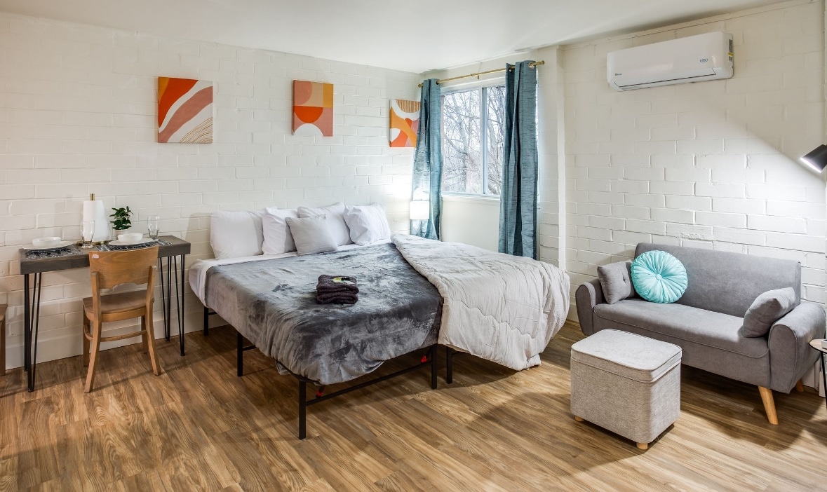 Unwind in this modern, fully furnished apartment designed for comfort and productivity. Perfect for traveling professionals, medical staff, or remote workers, this quiet retreat features a cozy queen bed, blackout curtains, a dedicated workspace, and high-speed WiFi. Enjoy a fully equipped kitchen, in-building washer/dryer, and free parking. Conveniently located near hospitals, business hubs, and downtown attractions. Your ideal home away from home!