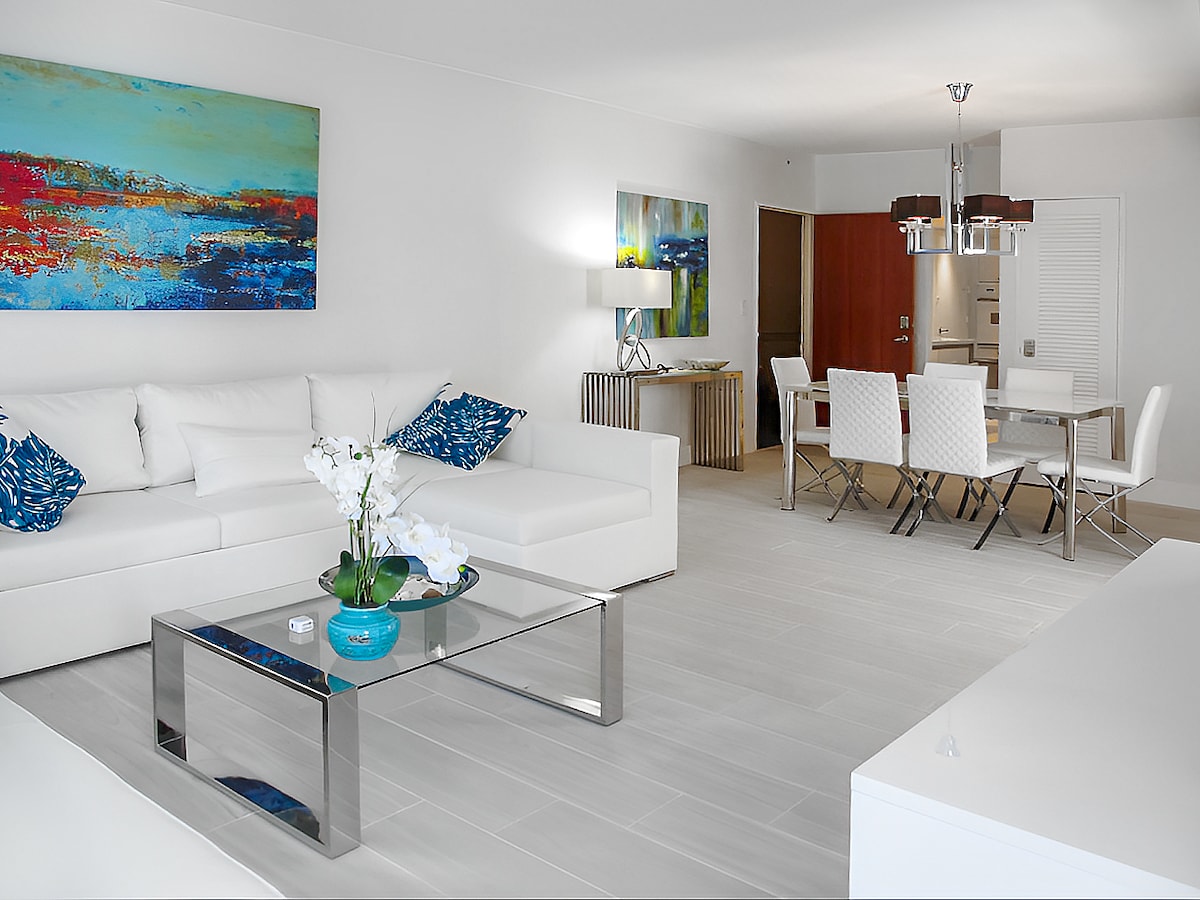 Wake up in this luxury 2 bedroom apartment. Drink your morning coffee in the huge balcony while looking at the breathtaking ocean views. FREE parking and access to resort amenities. Designer decorated High speed internet King bed and two full beds Two desks for home office Tennis and basketball courts Pool Jacuzzi Steps away from the beach and very close to shopping centers, restaurants, art galleries and attractions. Great for romantic getaways or families.