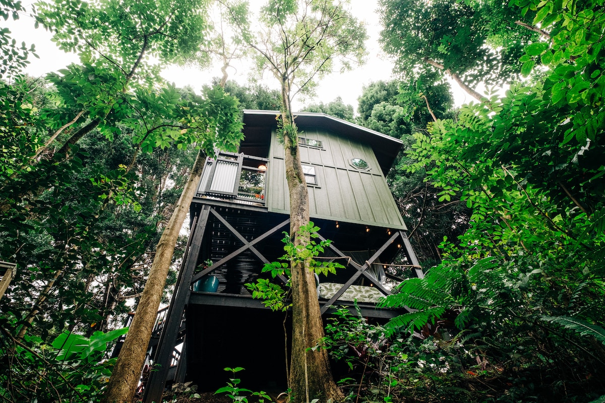 A beautiful get-away surrounded by nature on a cacao farm! One-bedroom + loft cabin, full kitchen, bathroom, w/d, sunny lanai, on our Big Island off-grid permaculture farm. Cabin is nestled in a food forest a few hundred feet from a stunning waterfall with swimming hole in a peaceful bamboo grove. One king-size bed in bedroom, two twin beds in loft, which has low ceiling & is accessed by steep narrow stairs. Free entrance to botanic garden. Organic eggs, homemade chocolate at farmstand!