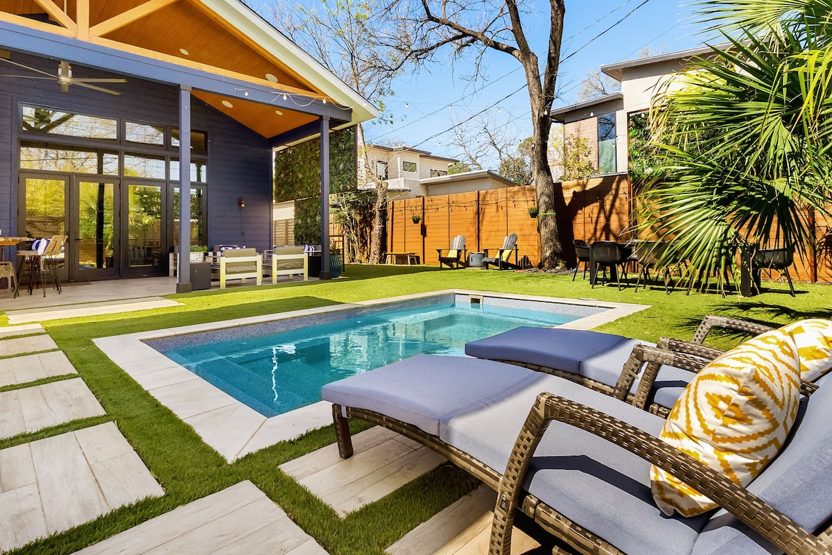 5-Bedroom haven with private pool & hot tub within minutes of downtown nightlife. Relax in designer bedrooms, cook for a crowd in the chef's kitchen, then splash outside under Texas skies. Heated pool + spa Fast Wi-Fi & workspace Free parking for 4 cars Walk to East Austin tacos, coffee & bars. Book early-weekends fill fast! Sleeps 16 5 Bedroom 4 Bath 4 King Beds 4 XL Twin 4 Twin Fire Pit Heated Pool Hot Tub Putting Green Chef's Kitchen Dedicated Work Station Peloton This is the spot!