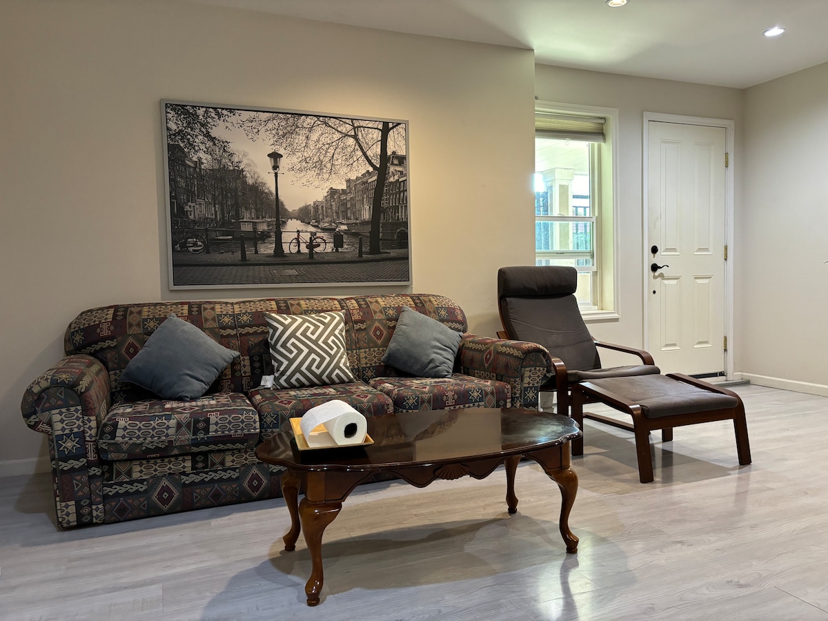 Welcome to our newly renovated self-contained suite, conveniently located close to the city center and attractions. With a private entrance, enjoy privacy and flexibility. The suite, situated on the ground level basement, offers ample natural light. Inside, find a cozy bedroom with a queen-sized bed and a studio double bed with curtains for privacy. The living room also has a sofa bed for additional sleeping space. Stay connected with free WIFI and parking in the safe neighborhood.