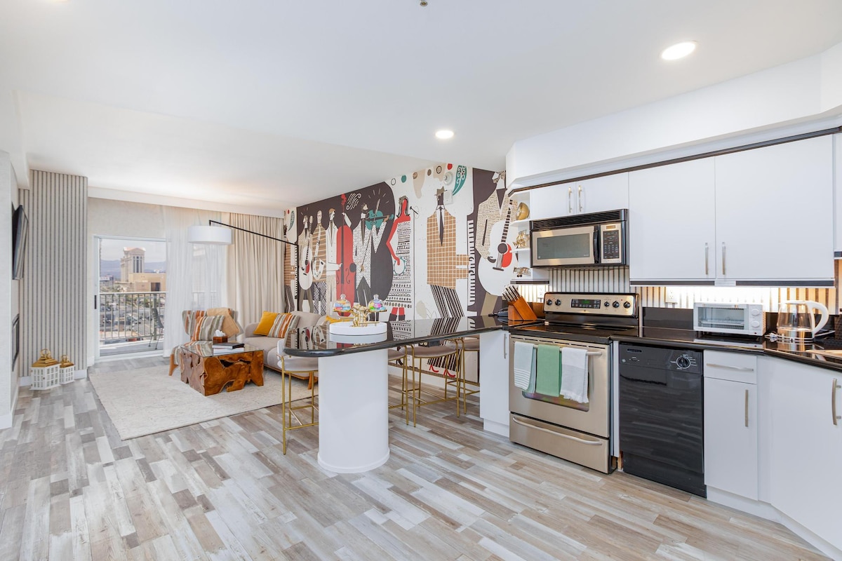 This one of a kind 2 bedroom 2 bathroom suite is all yours. Enjoy a spacious living room and a full kitchen perfect for the whole family. Fully stocked w/ plush towels, cotton sheets, dreamy mattress' & all kinds of utensils for any level of cooking. Heated indoor/outdoor pool, FREE PARKING, huge gym and FREE high speed WIFI are one of many entertainment options. Located near the Sphere and the Las Vegas Convention Center. Walking distance to the world famous Las Vegas strip!