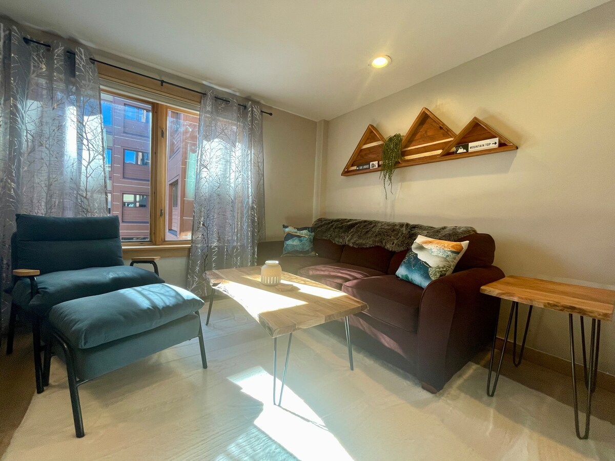 直达滑雪场的1卧室公寓,步行5分钟即可抵达主街