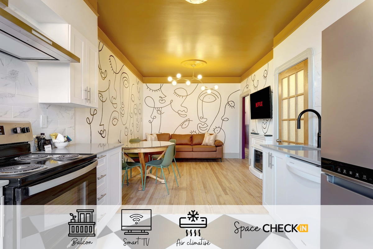 Welcome to your ideal home for exploring Montreal! Walking distance: 5 min ➤ Saint-Laurent Blvd and Metro Sherbrooke 10 min ➤ DT MTL (Quartier des spectacles) 30 min ➤ Old Port ✨Recently renovated by a designer ✨High-end appliances and furniture ✨Free street parking (subject to availability and zoning) ✨Nightlife just 5 minutes away on foot ✨Ultra-fast Wi-Fi for all your needs ✨Thoughtfully designed for your comfort and well-being