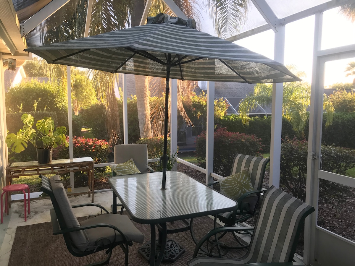 Prime Location –S. of 44 🔐 PRIVATE Entry & PRIVATE Full Guest Suite (bed/bath) Host BR opposite end of home 👍GUEST Passes- FREE 🌼 Flower Garden+Wind Chimes view BR 🏊♂️ Heated POOL – 2 min walk 🛏 New Sealy Q Bed, WiFi, RokuTV (Netflix, Prime, Peacock), Workstation,Sound Machine, yoga mat 🛁 Bath essentials +shower/tub ☕ Coffee, tea & light BFAST 🍴 FULL kITCHEN access & DIN room 🧺 W/D , screened LANAI, back yrd priv fence Outside security camera & Ring 🛋️ 3rd person sleep recliner sofa