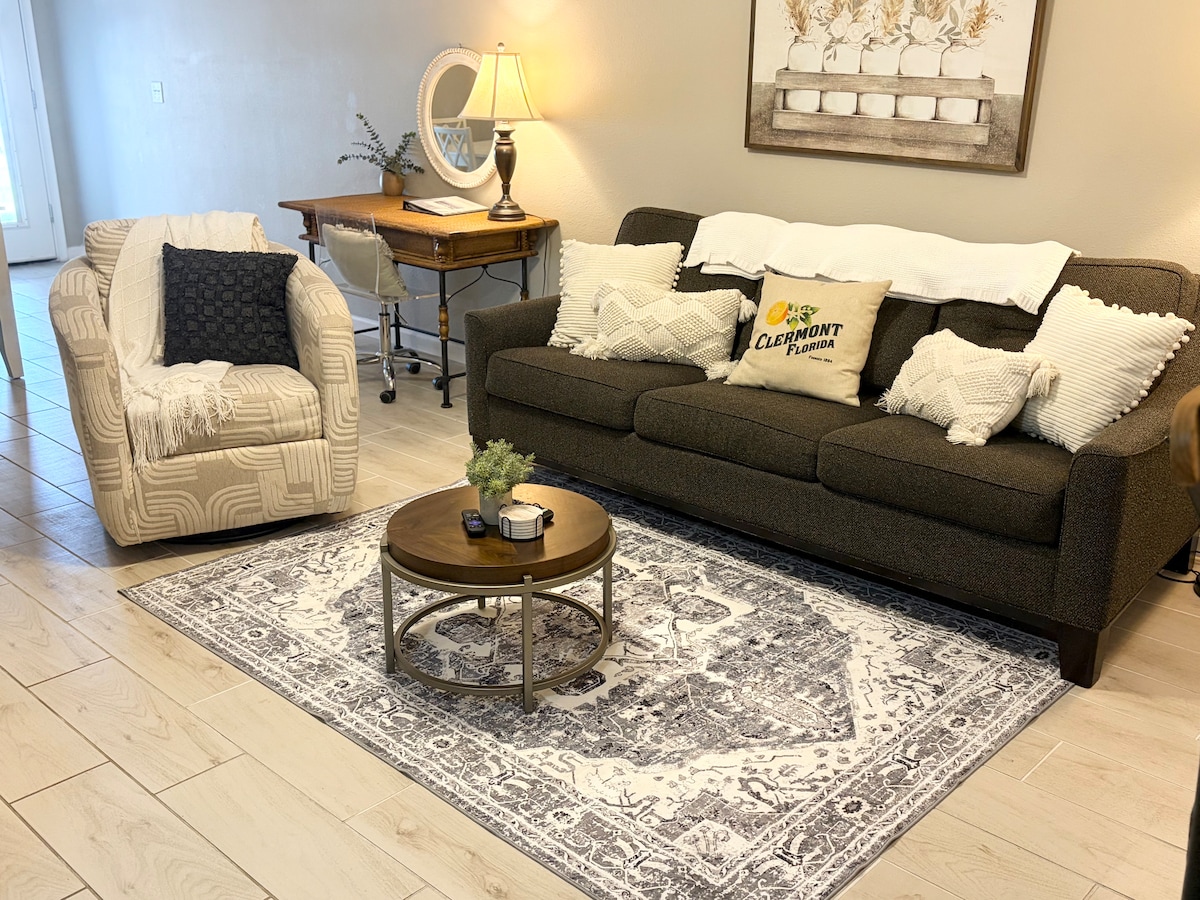 Charming retreat in The Villages. GOLF CART INCLUDED w/ waiver & documents see below. Our 2BR/2BA offers upgrades including walk-in showers, adjustable queen beds, modern kitchen, e-fireplace, & large TVs. You'll have access to a wealth of amenities, free golf on 41 executive courses to refreshing pools, tennis, pickleball, & more. The Villages charges a $50 fee for the two lifestyle IDs. Please book your stay with us, & experience luxury living at our vacation rental in The Villages