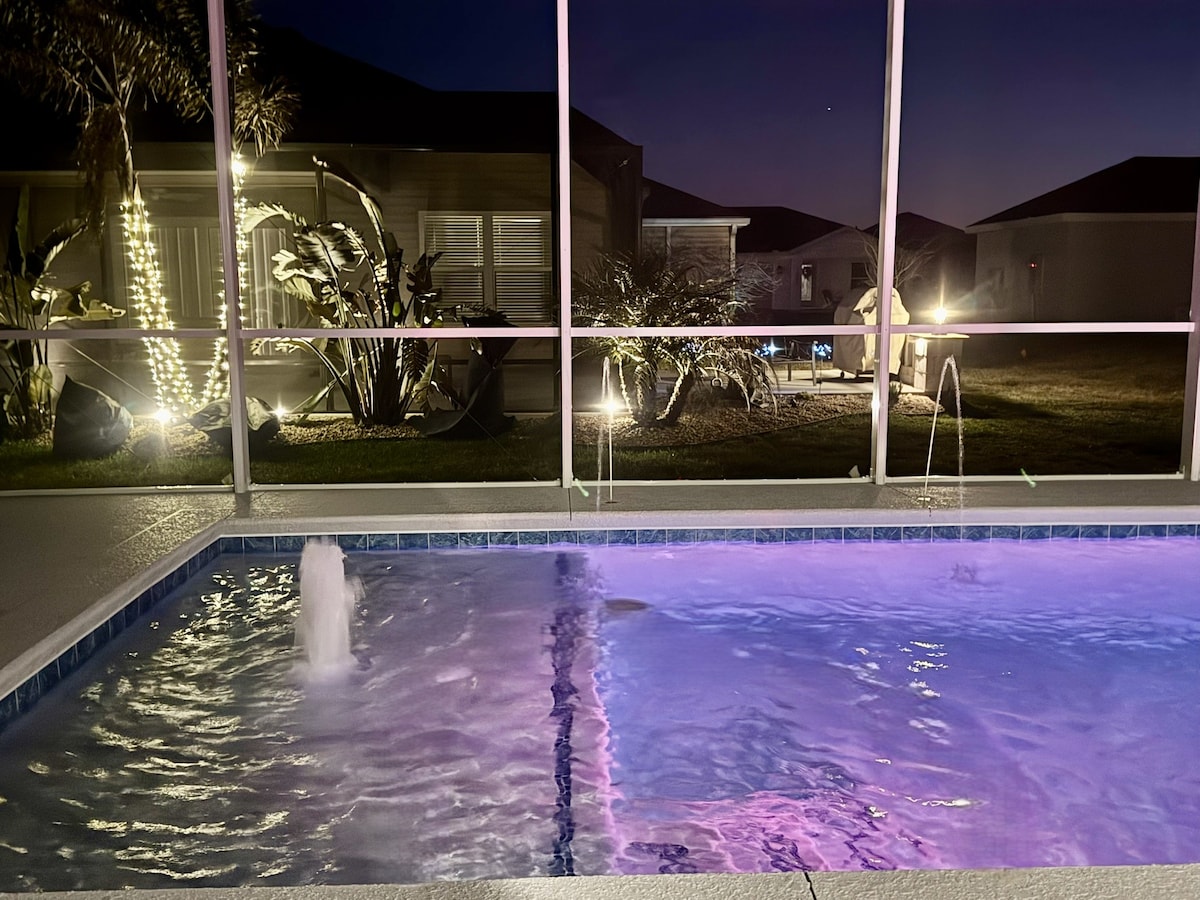 GREAT LOCATION!! A beautiful 2 bedroom 2 bath home with a saltwater pool and a hot tub. 77 inch TV with sound system, and 2 car garage/golf cart . Outdoor bar with big screen TV with seating area and a second seating area outside the bird cage. TV’s in both bedrooms. Great out door living! Minutes to everything via golf car: Brownwood 12 Sumter 16 Sawgrass 19. 4 champ golf and 7 exec golf courses 5-10. Publix, Walmart 5 minutes Golf Car 2022 Yamaha included! No smoking!!