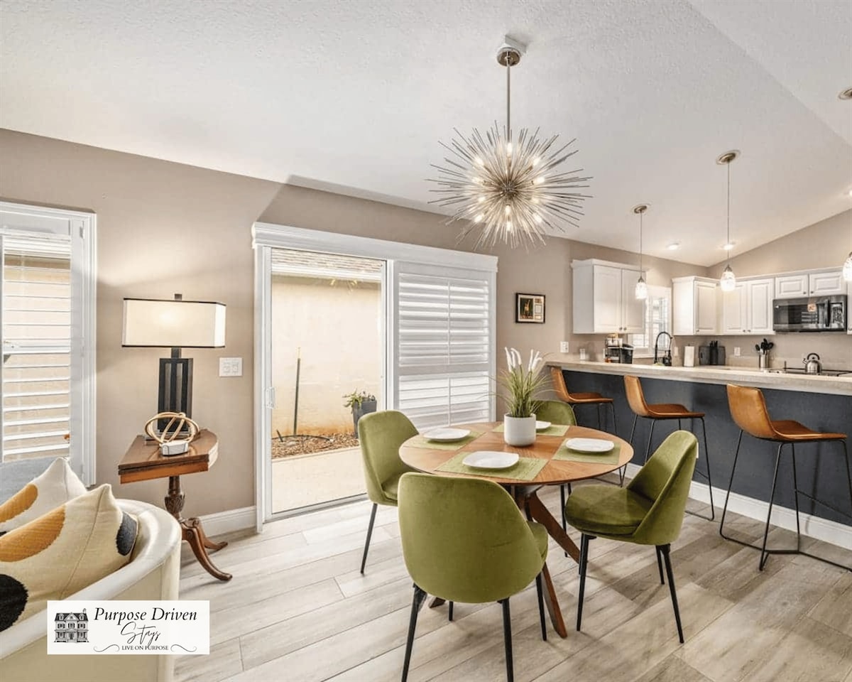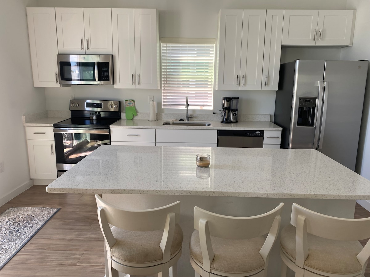 Welcome to this brand-new 3BR/2BA home, perfectly located 1/4 mile from Eastport Town Square in The Villages! Enjoy a modern, comfortable stay w/ a king bed in the primary suite, two queen bedrooms, & smart TVs throughout. The new kitchen features stainless appliances, quartz counters, & all your cooking essentials. Fast Wi-Fi and an in-unit washer/dryer. Relax outside on the furnished huge lanai, or explore amazing nearby amenities: Waters Edge Pool & Rec Center Bellaire Executive Golf