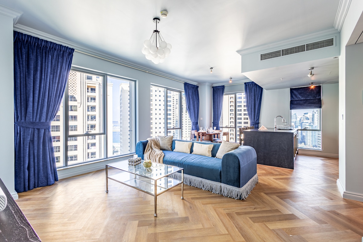 The stylish 3 bedroom apartment located in the most attractive area of Dubai - Jumeirah Beach Residence .It has stunning unobstructed views out to the sea, as well as of Dubai Eye and Bluewaters island and is less than 2 minutes from the JBR beach and the famous beachfront The Walk, where there are fabulous restaurants, cafes, boutiques and entertainments. The apartment is fully furnished ,equipped and decorated to a high standard, making it luxuries home for families on vacation.