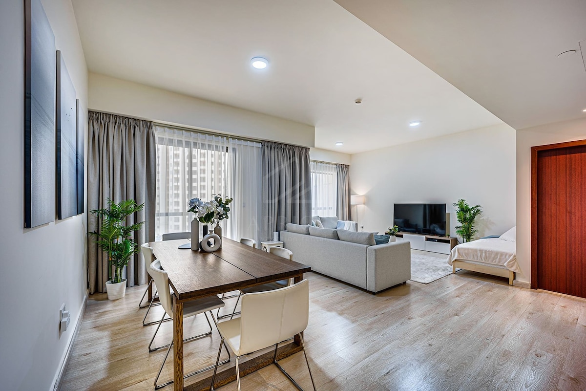Ihaca welcomes you to your private studio in the heart of Dubai’s most iconic beachfront destination, Jumeirah Beach Residence (JBR). Perched on the 10th floor, this beautifully positioned apartment offers uninterrupted panoramic views of the world’s tallest observation wheel, Ain Dubai, the stunning Bluewaters Island, and the lively JBR Walk. Watch yachts drift across the water while the palm-lined promenade comes alive below with chic cafés, stylish boutiques, and vibrant street performances.