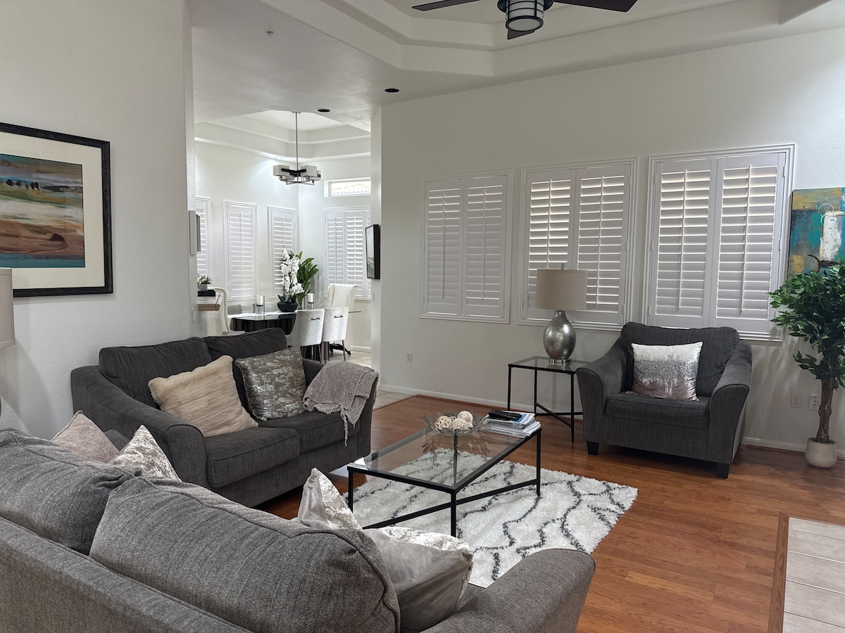 Welcome to Scottsdale Great Escape, your spacious and sunlit retreat. The open layout invites an abundance of natural light, creating a warm and inviting atmosphere. Whether you're here to work or unwind, we've got you covered with high-speed WiFi in the dedicated workspace, a fully equipped kitchen, a delightful backyard patio with an outdoor grill, and a cozy sofa where you can unwind and enjoy your favorite TV shows. For added convenience, there is an attached garage.