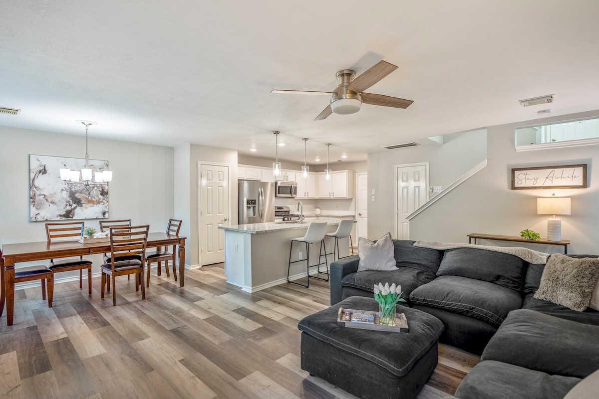 🍃Casa Granada is the perfect getaway home for families and groups- modern and cozy! Our floor to ceiling sliding glass doors, reveal our large, private backyard. Making this home, truly one of a kind. Only minutes away from The Woodlands and shops on Market street. Enjoy a night in with our Philips hue lights to set the perfect mood. You can also work remotely or hit the home gym! WIFI/TV/PARKING/CENTRAL AC/WASHER/DRYER/PATIO/GYM **For a grill: must be requested 24 hours before check in