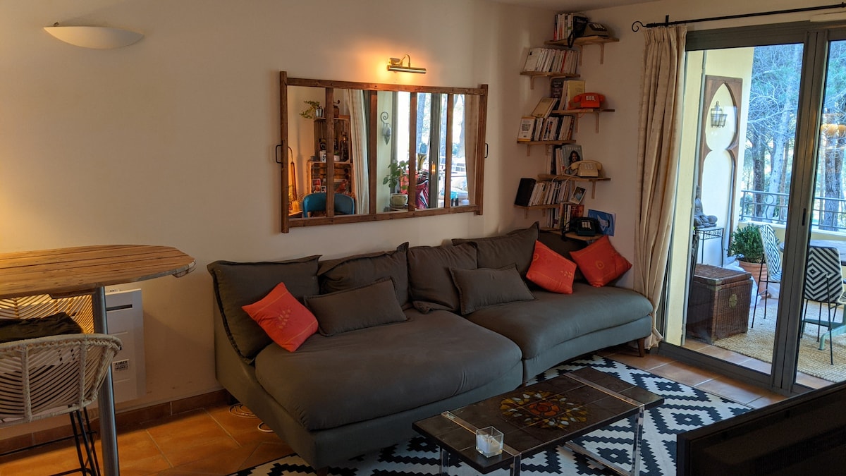 Meublé de tourisme classé 4 * : 65m2 dans écrin de verdure. La terrasse privative donne sur une forêt de chênes et de pins avec vue sur les collines. Une chambre avec un grand lit (qualité hotellerie) et une salle de bain attenante + une cuisine ouverte toute équipée et donnant sur un salon avec 2 banquettes-lits simples. Équipement complet, piscine partagée avec les propriétaires Nous serons ravis d’échanger sur les bonnes adresses de la région si les voyageurs le souhaitent.