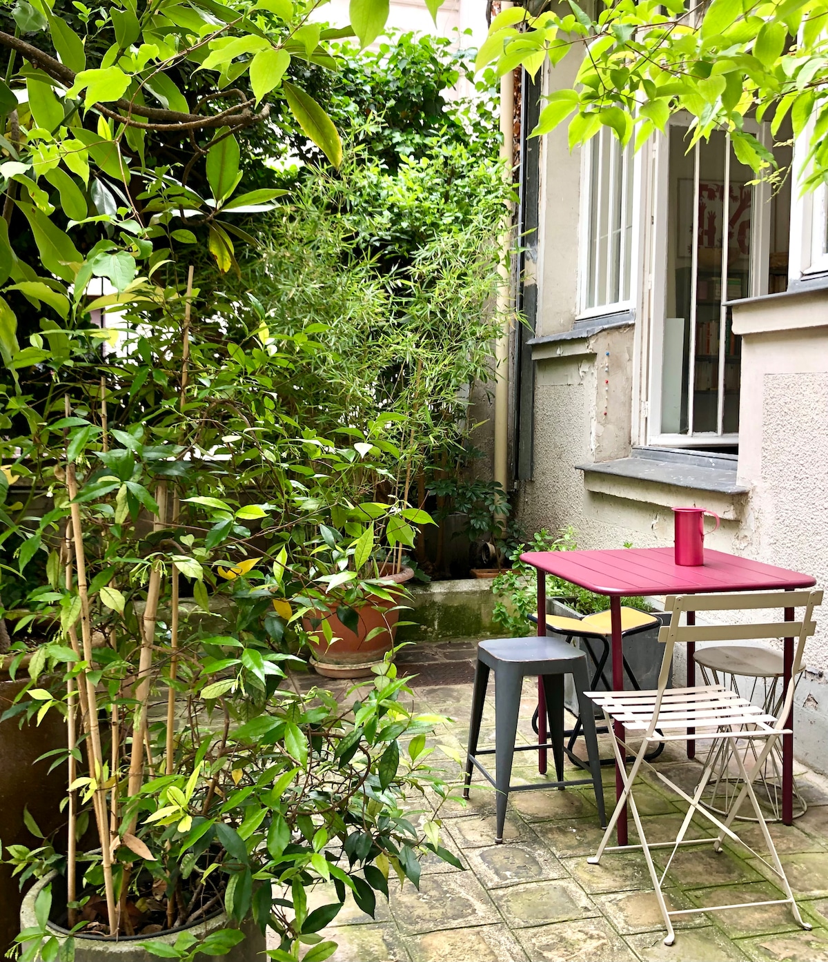 Luxurious and intimate, this secluded urban oasis is tucked away on a residential street in bustling Bastille, one of the most authentic and hippiest areas of Paris. Surrounded by some really good restaurants, farmer markets, designer stores and art galleries, it offers all the amenities you would find in a 5-star hotel, including a secluded private outdoor patio with its lush greenery. Famous Place des Vosges and Le Marais are just a short walk away.