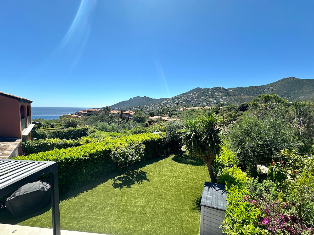 50 m² duplex apartment with swimming pool and breathtaking sea view, completely renovated and air-conditioned, it is composed of a kitchen open to the living/dining room, a bedroom with balcony, a bathroom with shower and WC, a separate WC/sink on the ground floor, a covered terrace with a table, a private garage. The geographical position will allow you direct access to leisure activities at sea and hiking trails in the Estérel park. Facilities: Wifi, Air conditioning.
