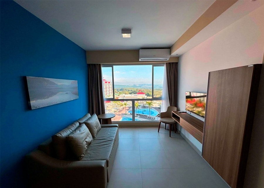 O Resort é amplo e muito agradável, com piscinas quentes e frias, sauna, salão de jogos, equipe de recreação, spa com ofurô, sala de massagem, playground, brinquedoteca, cinema, academia, restaurantes e bares. Apartamento para até 5 pessoas: 1 cama de casal queen ou 2 de solteiro (conforme a solicitação) + 1 bicama + 1 sofá-cama casal. O Thermas Water Park fica à 3 minutos caminhando (entrada não incluída, compra no local com frequentes descontos para hóspedes).